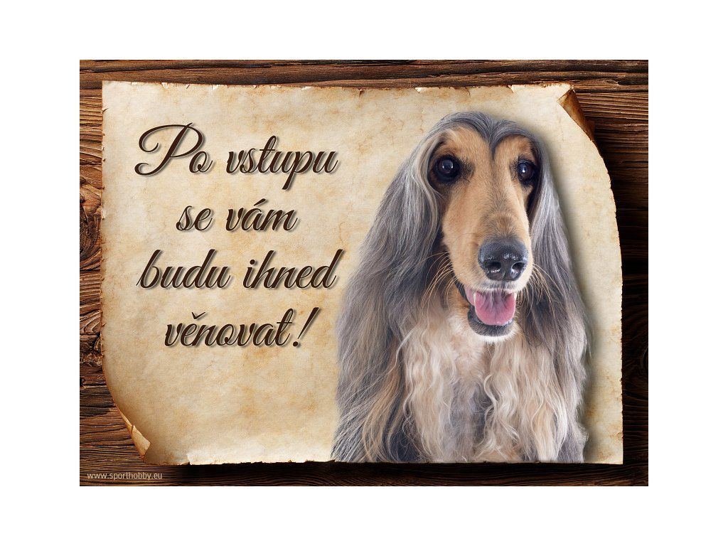 Cedulka Afghánský chrt II, hliníková s nápisem "Po vstupu se vám budu hned věnovat!" Kovová výstražná venkovní cedulka oznamující to či ono, že se ve vašem obydlí může návštěvník setkat s vašim čtyřnohým miláčkem a jeho teritoriem. Velikosti těchto cedulek jsou 15x11,25 a 20x15 cm. Cedulky jsou tištěny sublimační technologií Grawerton přímo na plech. Cedulky dodáváme běžně se zakulacenými rohy. Pokud budete chtít na cedulku vlastní text, napište nám jej do poznámky.