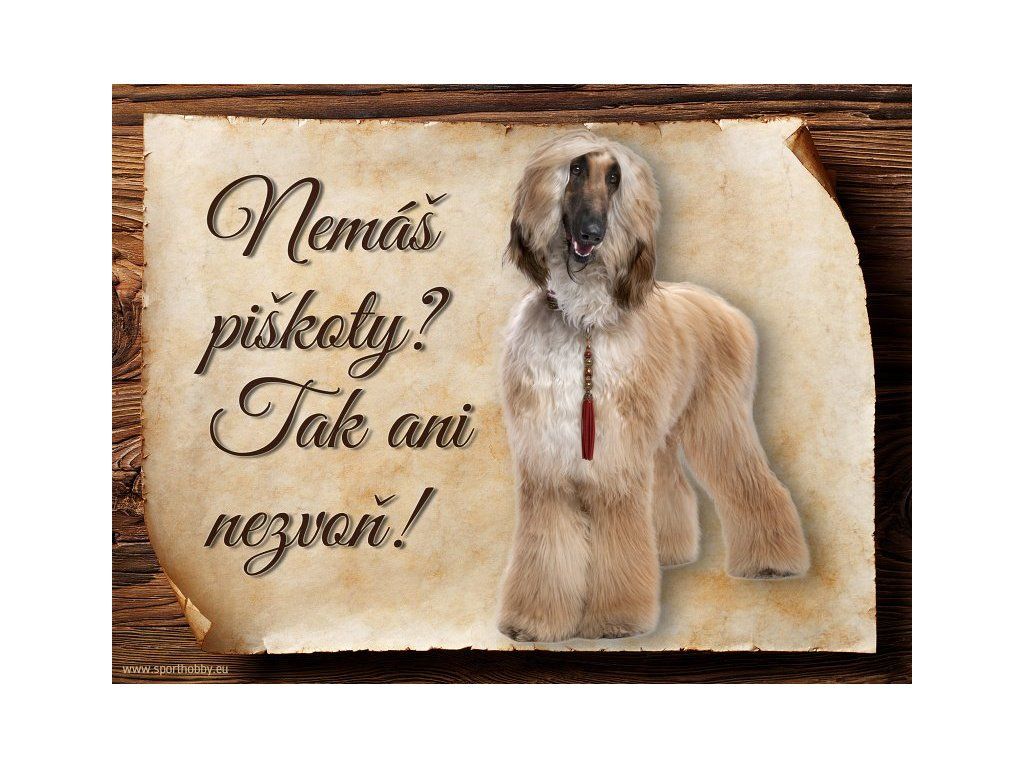 Cedulka Afghánský chrt hliníková s nápisem "Nemáš piškoty? Tak ani nezvoň!" Kovová výstražná venkovní cedulka oznamující to či ono, že se ve vašem obydlí může návštěvník setkat s vašim čtyřnohým miláčkem a jeho teritoriem. Velikosti těchto cedulek jsou 15x11,5 a 20x15 cm. Cedulky jsou tištěny sublimační technologií Grawerton přímo na plech. Cedulky dodáváme běžně se zakulacenými rohy. Pokud budete chtít na cedulku vlastní text, napište nám jej do poznámky.