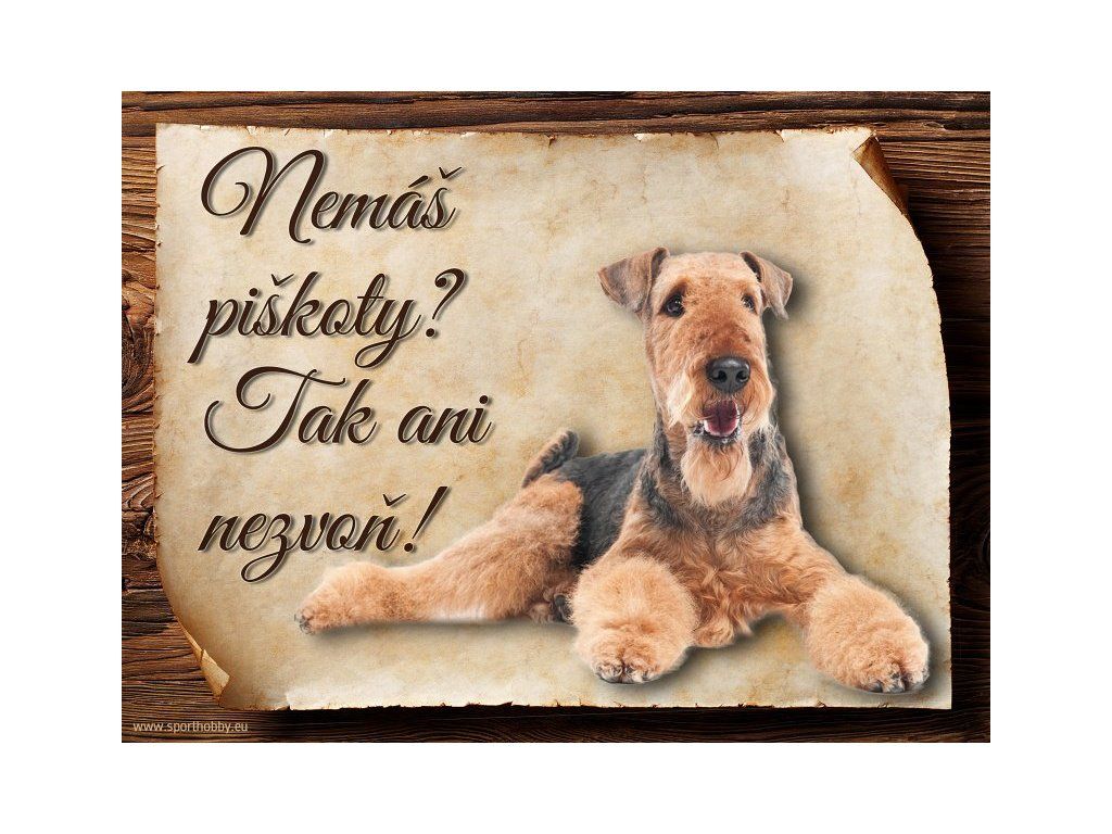 Cedulka s Airedalským Terrierem, hliníková s nápisem "Nemáš piškoty? Tak ani nezvoň!" Kovová výstražná venkovní cedulka oznamující to či ono, že se ve vašem obydlí může návštěvník setkat s vašim čtyřnohým miláčkem a jeho teritoriem. Velikosti těchto cedulek jsou 15x11,25 a 20x15 cm. Cedulky jsou tištěny sublimační technologií Grawerton přímo na plech. Cedulky dodáváme běžně se zakulacenými rohy. Pokud budete chtít na cedulku vlastní text, napište nám jej do poznámky.