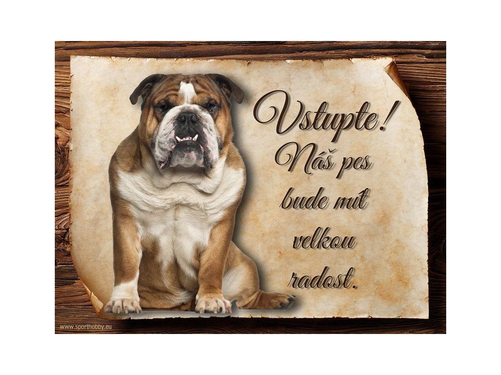Cedulka s Anglickým buldogem, hliníková s nápisem "Vstupte! Náš pes bude mít velkou radost!" Kovová výstražná venkovní cedulka oznamující to či ono, že se ve vašem obydlí může návštěvník setkat s vašim čtyřnohým miláčkem a jeho teritoriem. Velikosti těchto cedulek jsou 15x11,25 a 20x15 cm. Cedulky jsou tištěny sublimační technologií Grawerton přímo na plech. Cedulky dodáváme běžně se zakulacenými rohy. Pokud budete chtít na cedulku vlastní text, napište nám jej do poznámky.