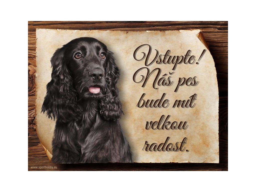 Cedulka s Anglickým kokršpanělem III, hliníková s nápisem "Vstupte! Náš pes bude mít velkou radost!" Kovová výstražná venkovní tabulka oznamující to či ono, že se ve vašem obydlí může návštěvník setkat s vašim čtyřnohým miláčkem a jeho teritoriem. Velikosti těchto cedulek jsou 15x11,25 a 20x15 cm. Cedulky jsou tištěny sublimační technologií Grawerton přímo na plech. Cedulky dodáváme běžně se zakulacenými rohy. Pokud budete chtít na cedulku vlastní text, napište nám jej do poznámky.