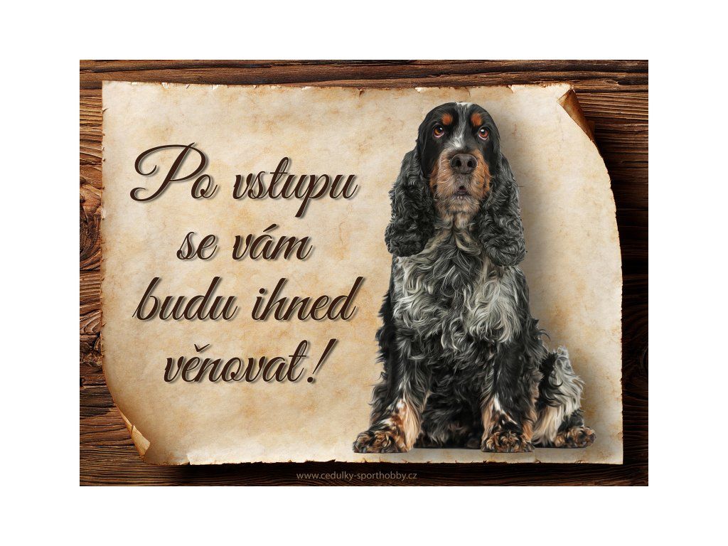 Cedulka s Anglický kokršpaněl V, hliníková s nápisem "Po vstupu se vám budu hned věnovat!" Kovová výstražná venkovní cedulka oznamující to či ono, že se ve vašem obydlí může návštěvník setkat s vašim čtyřnohým miláčkem a jeho teritoriem. Velikosti těchto cedulek jsou 15x11,25 a 20x15 cm. Cedulky jsou tištěny sublimační technologií Grawerton přímo na plech. Cedulky dodáváme běžně se zakulacenými rohy. Pokud budete chtít na cedulku vlastní text, napište nám jej do poznámky.