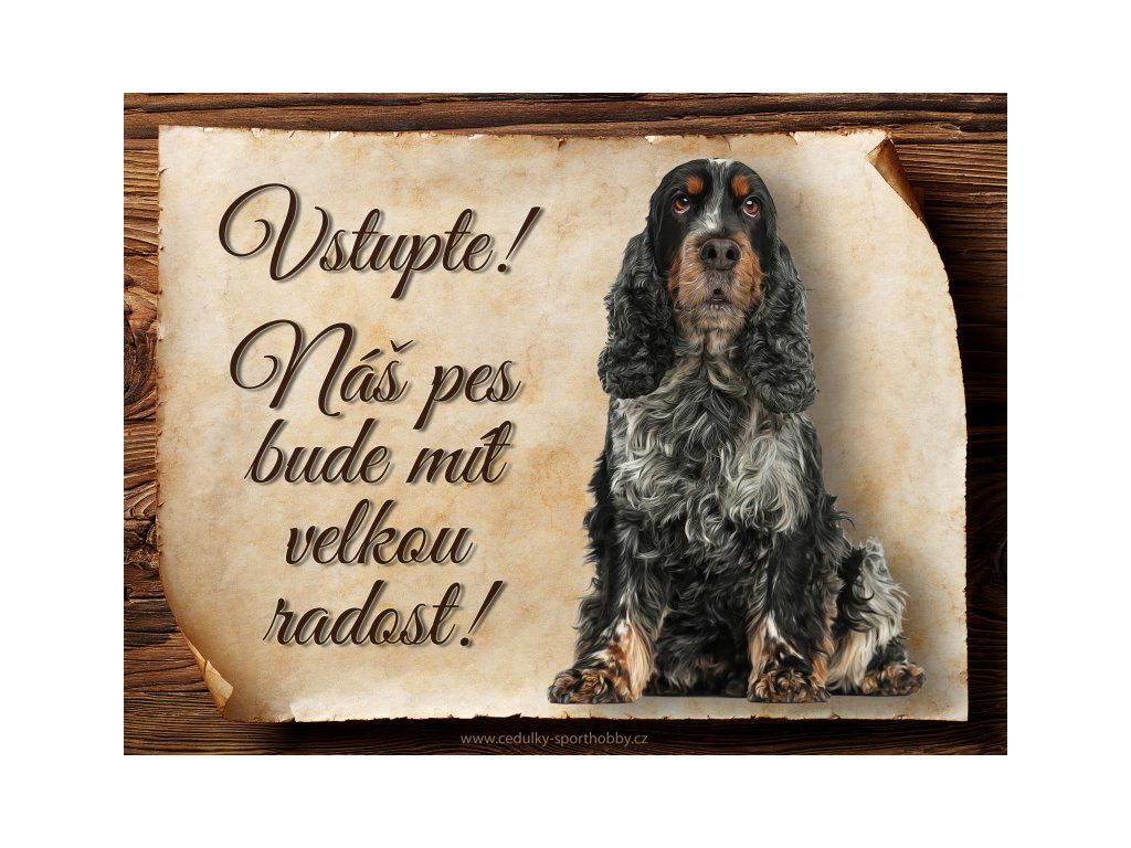 Cedulka s Anglický kokršpaněl V, hliníková s nápisem "Vstupte! Náš pes bude mít velkou radost!" Kovová výstražná venkovní tabulka oznamující to či ono, že se ve vašem obydlí může návštěvník setkat s vašim čtyřnohým miláčkem a jeho teritoriem. Velikosti těchto cedulek jsou 15x11,25 a 20x15 cm. Cedulky jsou tištěny sublimační technologií Grawerton přímo na plech. Cedulky dodáváme běžně se zakulacenými rohy. Pokud budete chtít na cedulku vlastní text, napište nám jej do poznámky.