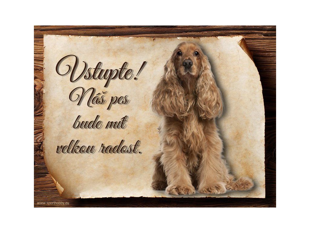 Cedulka s Anglickým kokršpanělem, hliníková s nápisem "Vstupte! Náš pes bude mít velkou radost!" Kovová výstražná venkovní tabulka oznamující to či ono, že se ve vašem obydlí může návštěvník setkat s vašim čtyřnohým miláčkem a jeho teritoriem. Velikosti těchto cedulek jsou 15x11,25 a 20x15 cm. Cedulky jsou tištěny sublimační technologií Grawerton přímo na plech. Cedulky dodáváme běžně se zakulacenými rohy. Pokud budete chtít na cedulku vlastní text, napište nám jej do poznámky.