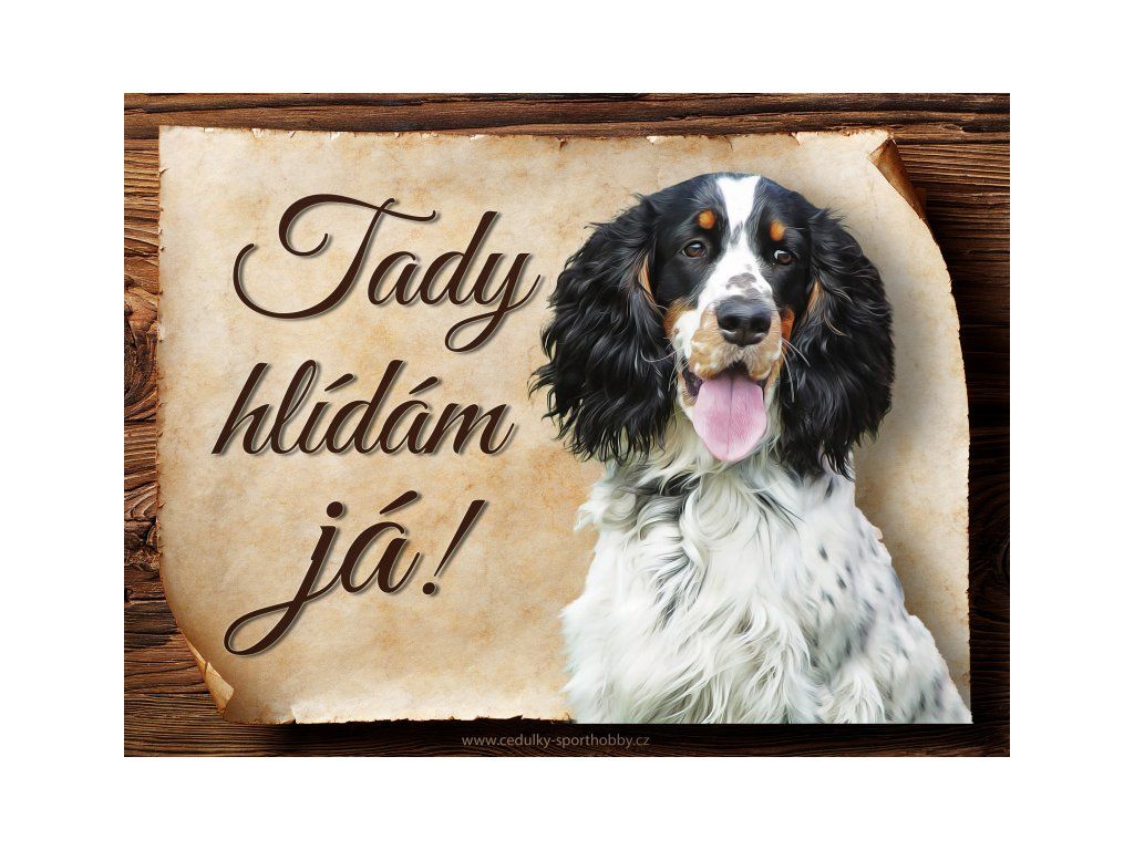 Cedulka Anglický špringršpaněl III, hliníková s nápisem "Tady hlídám já!" Kovová výstražná venkovní cedulka oznamující to či ono, že se ve vašem obydlí může návštěvník setkat s vašim čtyřnohým miláčkem a jeho teritoriem. Velikosti těchto cedulek jsou 15x11,25 a 20x15 cm. Cedulky jsou tištěny sublimační technologií Grawerton přímo na plech. Cedulky dodáváme běžně se zakulacenými rohy. Pokud budete chtít na cedulku vlastní text, napište nám jej do poznámky.