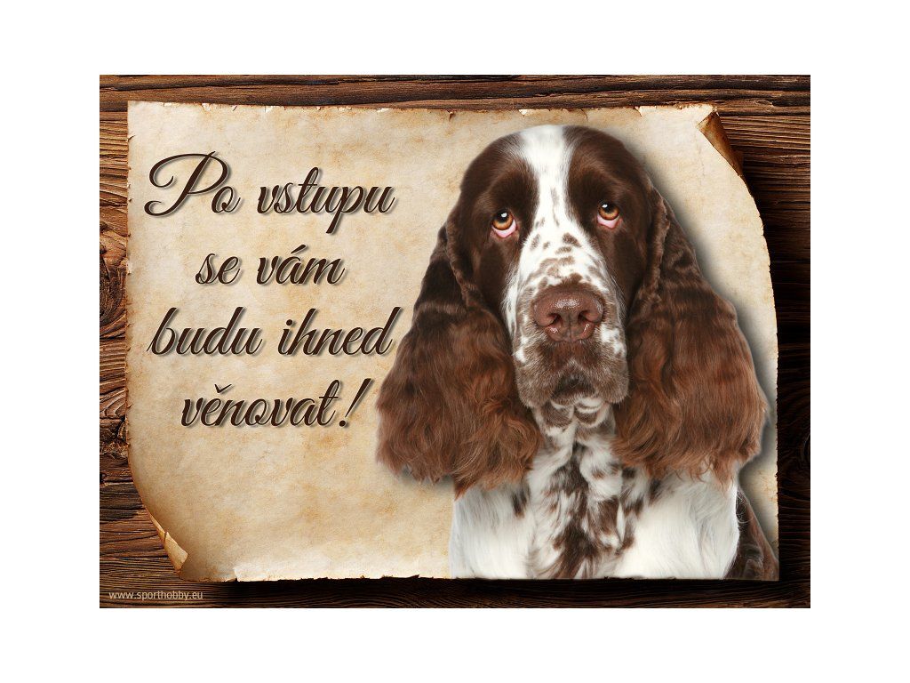 Cedulka Anglický špringršpaněl, hliníková s nápisem "Po vstupu se vám budu hned věnovat!" Kovová výstražná venkovní cedulka oznamující to či ono, že se ve vašem obydlí může návštěvník setkat s vašim čtyřnohým miláčkem a jeho teritoriem. Velikosti těchto cedulek jsou 15x11,25 a 20x15 cm. Cedulky jsou tištěny sublimační technologií Grawerton přímo na plech. Cedulky dodáváme běžně se zakulacenými rohy. Pokud budete chtít na cedulku vlastní text, napište nám jej do poznámky.