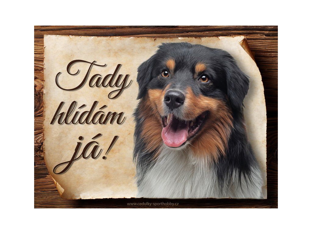 Cedulka Australský ovčák III, hliníková s nápisem "Tady hlídám já!" Kovová výstražná venkovní cedulka oznamující to či ono, že se ve vašem obydlí může návštěvník setkat s vašim čtyřnohým miláčkem a jeho teritoriem. Velikosti těchto cedulek jsou 15x11,25 a 20x15 cm. Cedulky jsou tištěny sublimační technologií Grawerton přímo na plech. Cedulky dodáváme běžně se zakulacenými rohy. Pokud budete chtít na cedulku vlastní text, napište nám jej do poznámky.