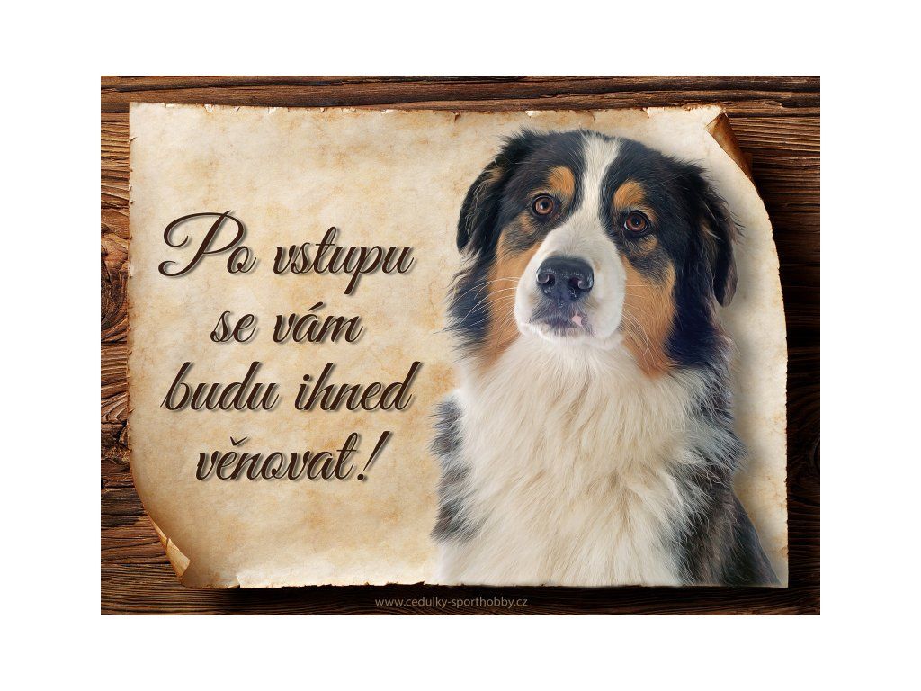 Cedulka Australský ovčák IV, hliníková s nápisem "Po vstupu se vám budu hned věnovat!" Kovová výstražná venkovní cedulka oznamující to či ono, že se ve vašem obydlí může návštěvník setkat s vašim čtyřnohým miláčkem a jeho teritoriem. Velikosti těchto cedulek jsou 15x11,25 a 20x15 cm. Cedulky jsou tištěny sublimační technologií Grawerton přímo na plech. Cedulky dodáváme běžně se zakulacenými rohy. Pokud budete chtít na cedulku vlastní text, napište nám jej do poznámky.