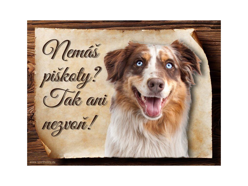 Cedulka Australský ovčák, hliníková s nápisem "Nemáš piškoty? Tak ani nezvoň!" Kovová výstražná venkovní cedulka oznamující to či ono, že se ve vašem obydlí může návštěvník setkat s vašim čtyřnohým miláčkem a jeho teritoriem. Velikosti těchto cedulek jsou 15x11,25 a 20x15 cm. Cedulky jsou tištěny sublimační technologií Grawerton přímo na plech. Cedulky dodáváme běžně se zakulacenými rohy. Pokud budete chtít na cedulku vlastní text, napište nám jej do poznámky.
