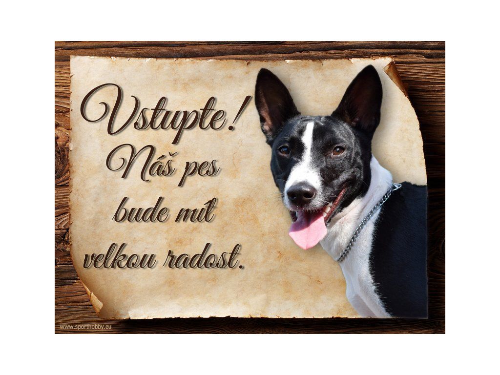 Cedulka s Basenji II, hliníková s nápisem "Vstupte! Náš pes bude mít velkou radost!" Kovová výstražná venkovní cedulka oznamující to či ono, že se ve vašem obydlí může návštěvník setkat s vašim čtyřnohým miláčkem a jeho teritoriem. Velikosti těchto cedulek jsou 15x11,25 a 20x15 cm. Cedulky jsou tištěny sublimační technologií Grawerton přímo na plech. Cedulky dodáváme běžně se zakulacenými rohy. Pokud budete chtít na cedulku vlastní text, napište nám jej do poznámky.