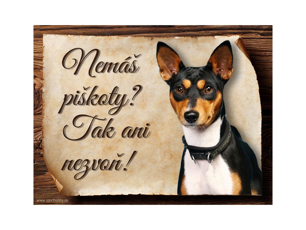 Cedulka s Basenji III, hliníková s nápisem "Nemáš piškoty? Tak ani nezvoň!" Kovová výstražná venkovní cedulka oznamující to či ono, že se ve vašem obydlí může návštěvník setkat s vašim čtyřnohým miláčkem a jeho teritoriem. Velikosti těchto cedulek jsou 15x11,25 a 20x15 cm. Cedulky jsou tištěny sublimační technologií Grawerton přímo na plech. Cedulky dodáváme běžně se zakulacenými rohy. Pokud budete chtít na cedulku vlastní text, napište nám jej do poznámky.