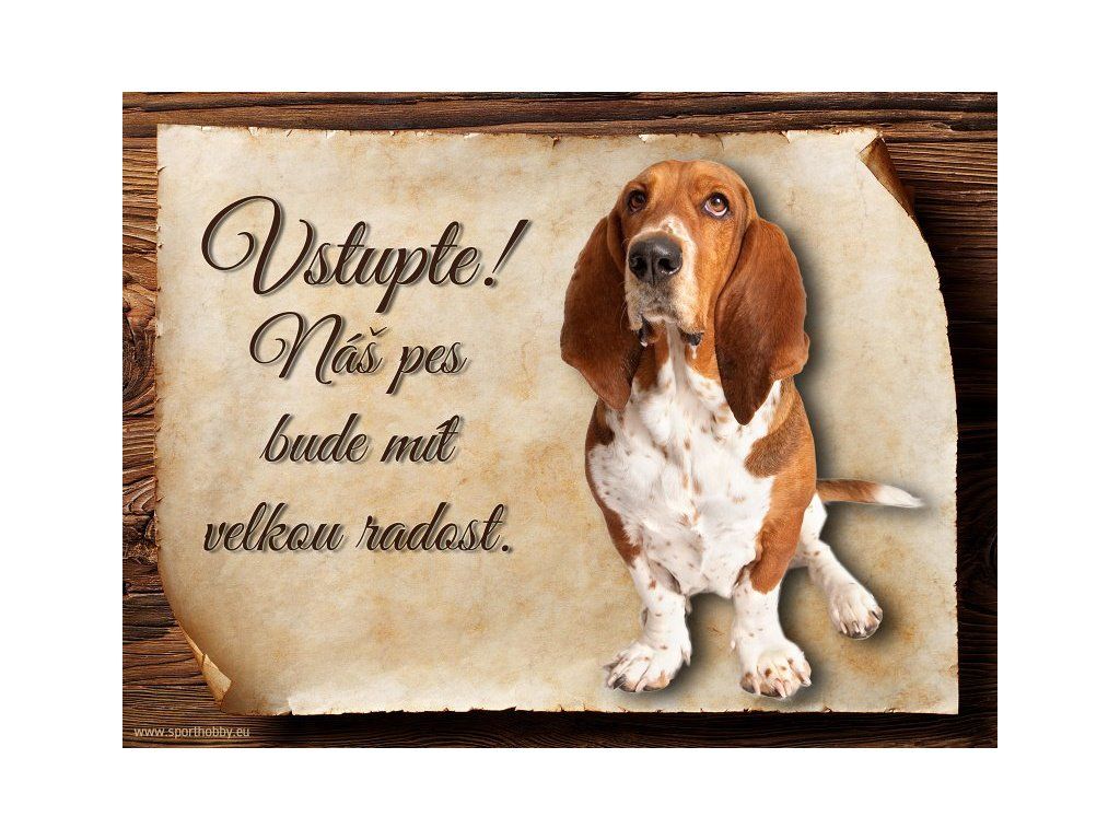 Cedulka s Basetem, hliníková s nápisem "Vstupte! Náš pes bude mít velkou radost!" Kovová výstražná venkovní cedulka oznamující to či ono, že se ve vašem obydlí může návštěvník setkat s vašim čtyřnohým miláčkem a jeho teritoriem. Velikosti těchto cedulek jsou 15x11,25 a 20x15 cm. Cedulky jsou tištěny sublimační technologií Grawerton přímo na plech. Cedulky dodáváme běžně se zakulacenými rohy. Pokud budete chtít na cedulku vlastní text, napište nám jej do poznámky.