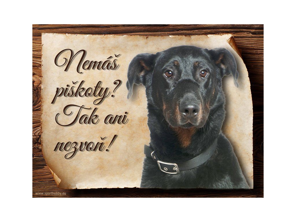 Cedulka Beauceron II, hliníková s nápisem "Nemáš piškoty? Tak ani nezvoň!" Kovová výstražná venkovní cedulka oznamující to či ono, že se ve vašem obydlí může návštěvník setkat s vašim čtyřnohým miláčkem a jeho teritoriem. Velikosti těchto cedulek jsou 15x11,25 a 20x15 cm. Cedulky jsou tištěny sublimační technologií Grawerton přímo na plech. Cedulky dodáváme běžně se zakulacenými rohy. Pokud budete chtít na cedulku vlastní text, napište nám jej do poznámky.