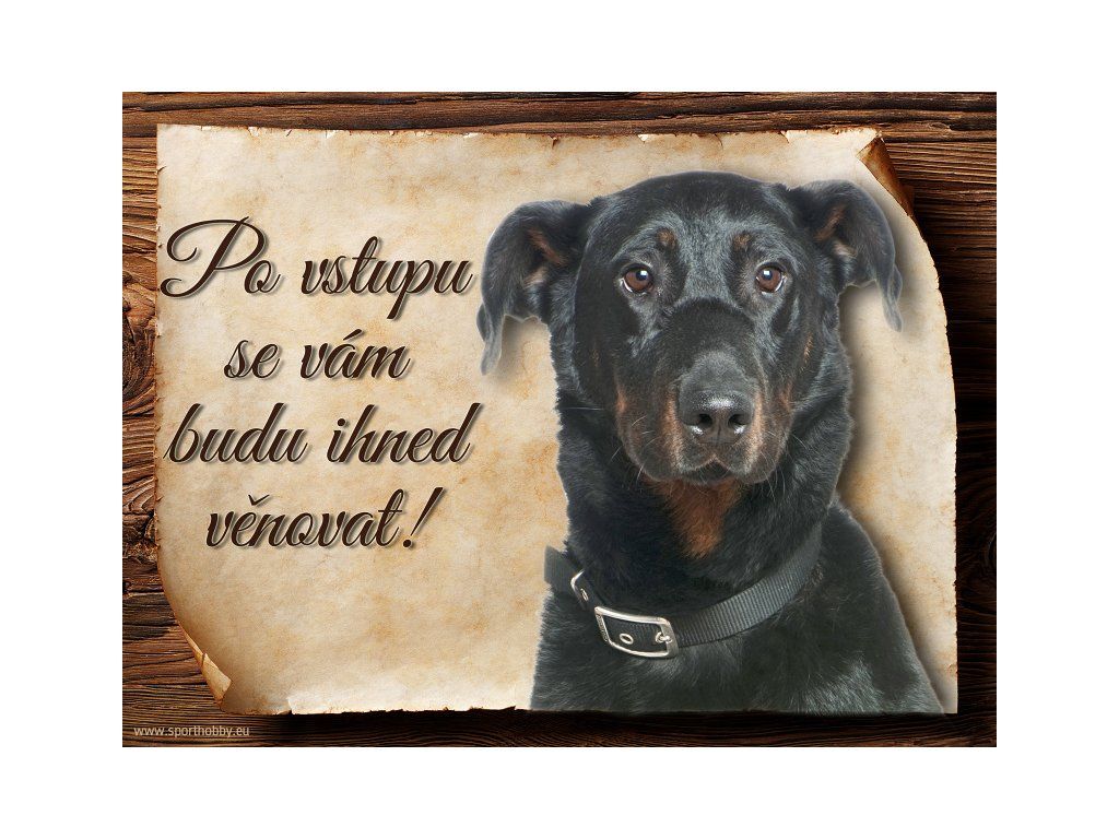 Cedulka Beauceron II, hliníková s nápisem "Po vstupu se vám budu hned věnovat!" Kovová výstražná venkovní cedulka oznamující to či ono, že se ve vašem obydlí může návštěvník setkat s vašim čtyřnohým miláčkem a jeho teritoriem. Velikosti těchto cedulek jsou 15x11,25 a 20x15 cm. Cedulky jsou tištěny sublimační technologií Grawerton přímo na plech. Cedulky dodáváme běžně se zakulacenými rohy. Pokud budete chtít na cedulku vlastní text, napište nám jej do poznámky.