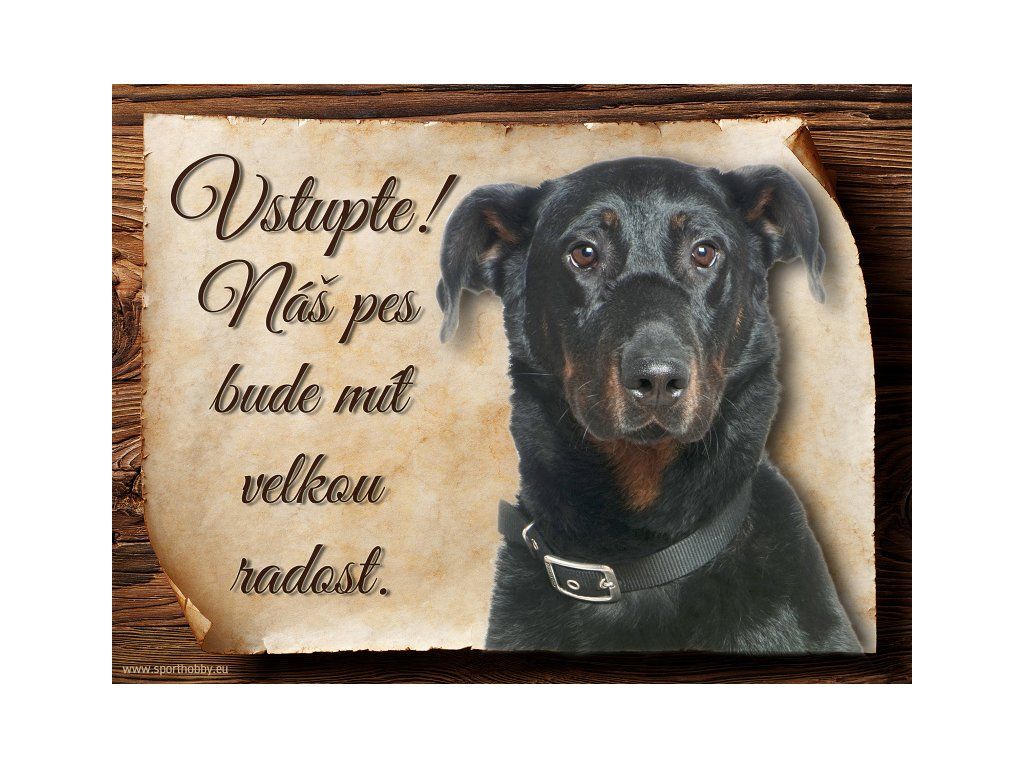Cedulka Beauceron II, hliníková s nápisem "Vstupte! Náš pes bude mít velkou radost!" Kovová výstražná venkovní cedulka oznamující to či ono, že se ve vašem obydlí může návštěvník setkat s vašim čtyřnohým miláčkem a jeho teritoriem. Velikosti těchto cedulek jsou 15x11,25 a 20x15 cm. Cedulky jsou tištěny sublimační technologií Grawerton přímo na plech. Cedulky dodáváme běžně se zakulacenými rohy. Pokud budete chtít na cedulku vlastní text, napište nám jej do poznámky.
