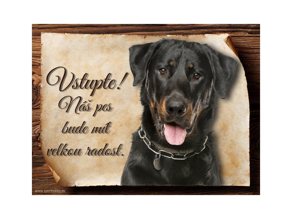 Cedulka Beauceron, hliníková s nápisem "Vstupte! Náš pes bude mít velkou radost!" Kovová výstražná venkovní cedulka oznamující to či ono, že se ve vašem obydlí může návštěvník setkat s vašim čtyřnohým miláčkem a jeho teritoriem. Velikosti těchto cedulek jsou 15x11,25 a 20x15 cm. Cedulky jsou tištěny sublimační technologií Grawerton přímo na plech. Cedulky dodáváme běžně se zakulacenými rohy. Pokud budete chtít na cedulku vlastní text, napište nám jej do poznámky.