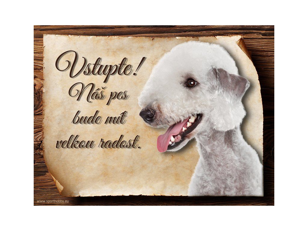 Cedulka Bedlington teriér, hliníková s nápisem "Vstupte! Náš pes bude mít velkou radost!" Kovová výstražná venkovní cedulka oznamující to či ono, že se ve vašem obydlí může návštěvník setkat s vašim čtyřnohým miláčkem a jeho teritoriem. Velikosti těchto cedulek jsou 15x11,25 a 20x15 cm. Cedulky jsou tištěny sublimační technologií Grawerton přímo na plech. Cedulky dodáváme běžně se zakulacenými rohy. Pokud budete chtít na cedulku vlastní text, napište nám jej do poznámky.