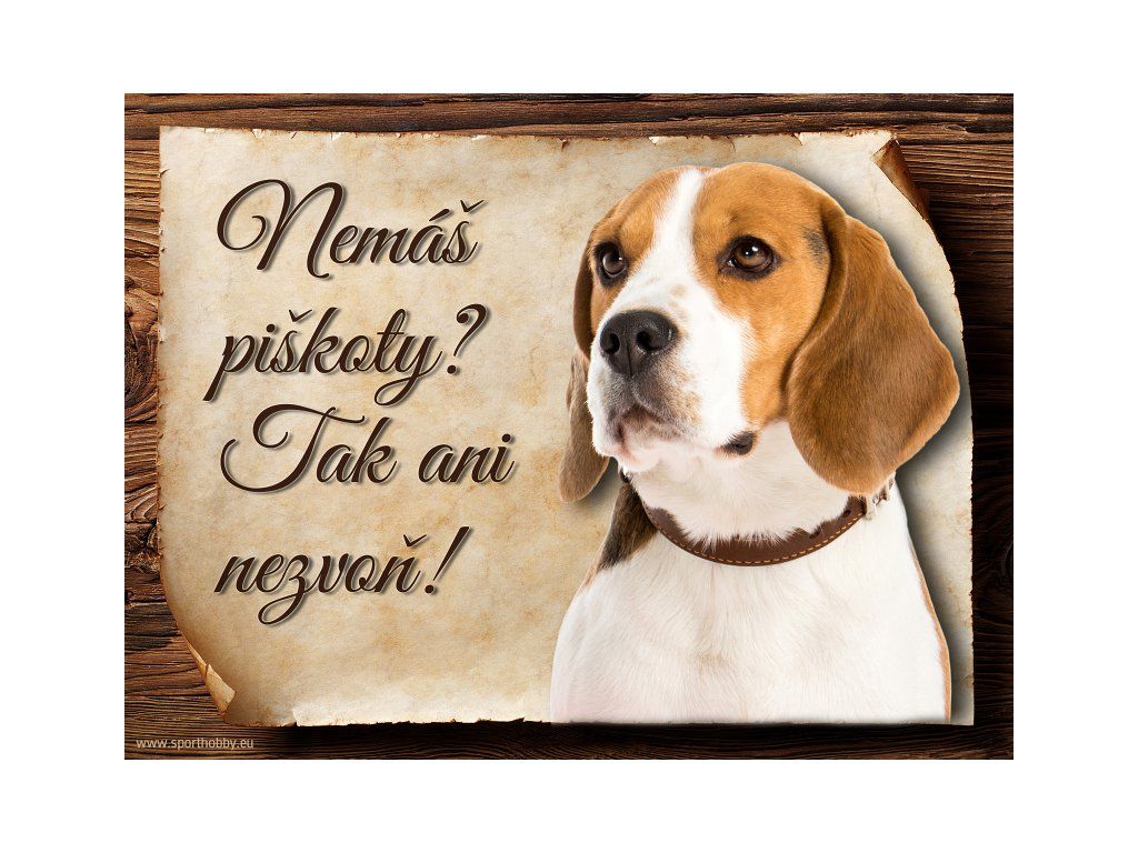 Cedulka Bígl, hliníková s nápisem "Nemáš piškoty? Tak ani nezvoň!" Kovová výstražná venkovní cedulka oznamující to či ono, že se ve vašem obydlí může návštěvník setkat s vašim čtyřnohým miláčkem a jeho teritoriem. Velikosti těchto cedulek jsou 15x11,25 a 20x15 cm. Cedulky jsou tištěny sublimační technologií Grawerton přímo na plech. Cedulky dodáváme běžně se zakulacenými rohy. Pokud budete chtít na cedulku vlastní text, napište nám jej do poznámky.