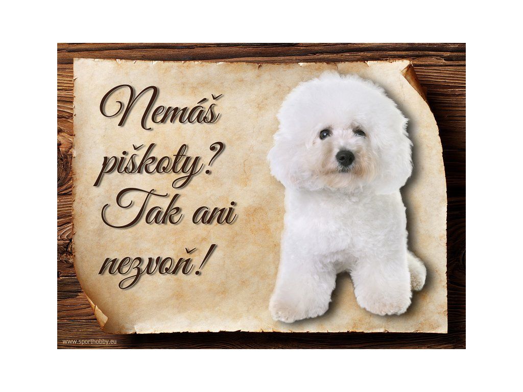 Cedulka Bišonek, hliníková s nápisem "Nemáš piškoty? Tak ani nezvoň!" Kovová výstražná venkovní cedulka oznamující to či ono, že se ve vašem obydlí může návštěvník setkat s vašim čtyřnohým miláčkem a jeho teritoriem. Velikosti těchto cedulek jsou 15x11,25 a 20x15 cm. Cedulky jsou tištěny sublimační technologií Grawerton přímo na plech. Cedulky dodáváme běžně se zakulacenými rohy. Pokud budete chtít na cedulku vlastní text, napište nám jej do poznámky.