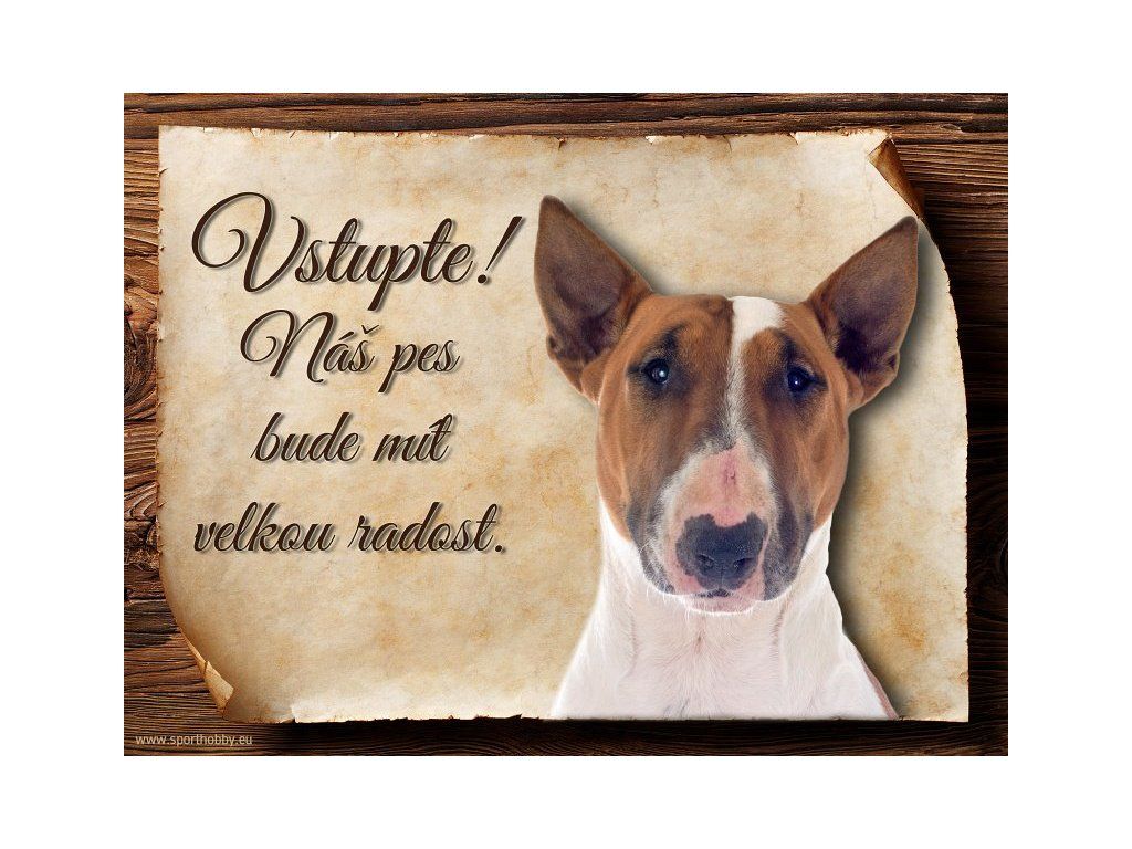 Cedulka Bullterier III, hliníková s nápisem "Vstupte! Náš pes bude mít velkou radost!" Kovová výstražná venkovní cedulka oznamující to či ono, že se ve vašem obydlí může návštěvník setkat s vašim čtyřnohým miláčkem a jeho teritoriem. Velikosti těchto cedulek jsou 15x11,25 a 20x15 cm. Cedulky jsou tištěny sublimační technologií Grawerton přímo na plech. Cedulky dodáváme běžně se zakulacenými rohy. Pokud budete chtít na cedulku vlastní text, napište nám jej do poznámky.