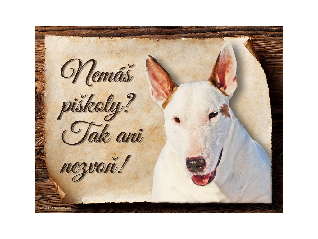 Cedulka Bullterier IV, hliníková s nápisem "Nemáš piškoty? Tak ani nezvoň!" Kovová výstražná venkovní cedulka oznamující to či ono, že se ve vašem obydlí může návštěvník setkat s vašim čtyřnohým miláčkem a jeho teritoriem. Velikosti těchto cedulek jsou 15x11,25 a 20x15 cm. Cedulky jsou tištěny sublimační technologií Grawerton přímo na plech. Cedulky dodáváme běžně se zakulacenými rohy. Pokud budete chtít na cedulku vlastní text, napište nám jej do poznámky.