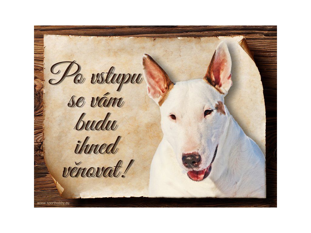Cedulka Bullterier IV, hliníková s nápisem "Po vstupu se vám budu hned věnovat!" Kovová výstražná venkovní cedulka oznamující to či ono, že se ve vašem obydlí může návštěvník setkat s vašim čtyřnohým miláčkem a jeho teritoriem. Velikosti těchto cedulek jsou 15x11,25 a 20x15 cm. Cedulky jsou tištěny sublimační technologií Grawerton přímo na plech. Cedulky dodáváme běžně se zakulacenými rohy. Pokud budete chtít na cedulku vlastní text, napište nám jej do poznámky.