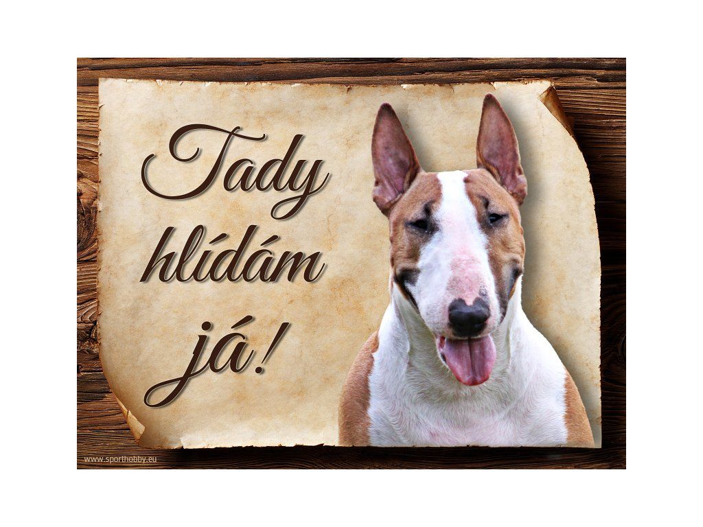 Cedulka Bullterier V, hliníková s nápisem "Vstupte! Náš pes bude mít velkou radost!" Kovová výstražná venkovní cedulka oznamující to či ono, že se ve vašem obydlí může návštěvník setkat s vašim čtyřnohým miláčkem a jeho teritoriem. Velikosti těchto cedulek jsou 15x11,25 a 20x15 cm. Cedulky jsou tištěny sublimační technologií Grawerton přímo na plech. Cedulky dodáváme běžně se zakulacenými rohy. Pokud budete chtít na cedulku vlastní text, napište nám jej do poznámky.