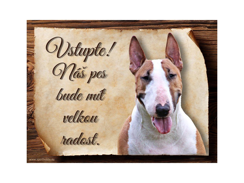 Cedulka Bullterier V, hliníková s nápisem "Vstupte! Náš pes bude mít velkou radost!" Kovová výstražná venkovní cedulka oznamující to či ono, že se ve vašem obydlí může návštěvník setkat s vašim čtyřnohým miláčkem a jeho teritoriem. Velikosti těchto cedulek jsou 15x11,25 a 20x15 cm. Cedulky jsou tištěny sublimační technologií Grawerton přímo na plech. Cedulky dodáváme běžně se zakulacenými rohy. Pokud budete chtít na cedulku vlastní text, napište nám jej do poznámky.