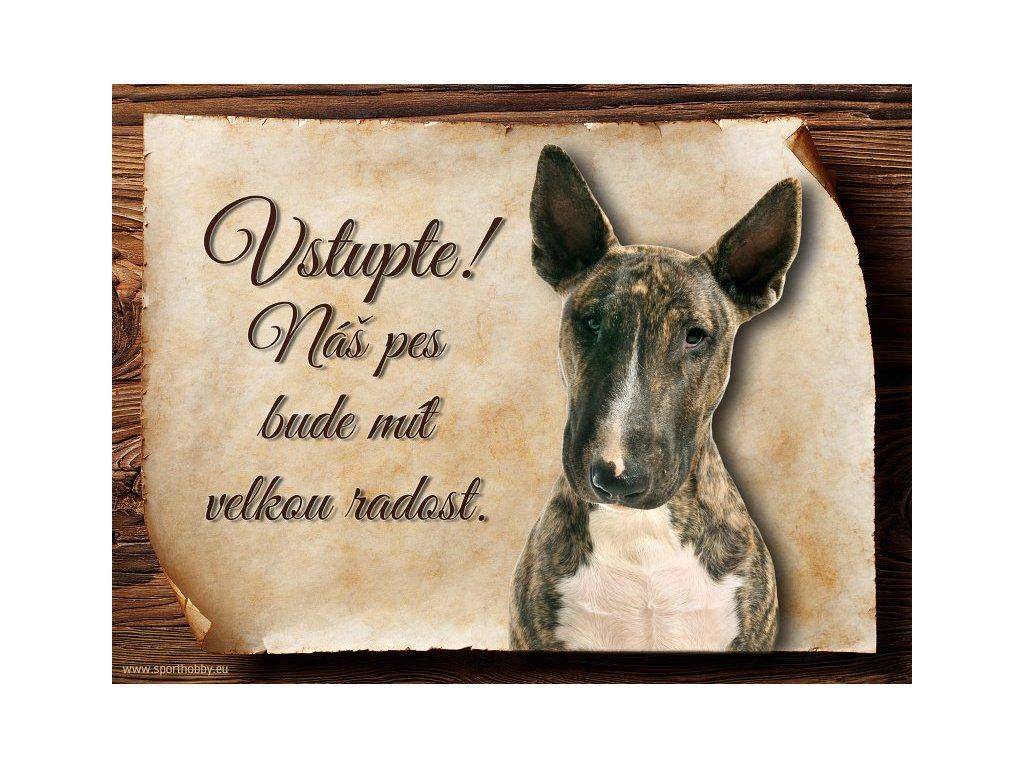 Cedulka Bullterier, hliníková s nápisem "Vstupte! Náš pes bude mít velkou radost!" Kovová výstražná venkovní cedulka oznamující to či ono, že se ve vašem obydlí může návštěvník setkat s vašim čtyřnohým miláčkem a jeho teritoriem. Velikosti těchto cedulek jsou 15x11,25 a 20x15 cm. Cedulky jsou tištěny sublimační technologií Grawerton přímo na plech. Cedulky dodáváme běžně se zakulacenými rohy. Pokud budete chtít na cedulku vlastní text, napište nám jej do poznámky.