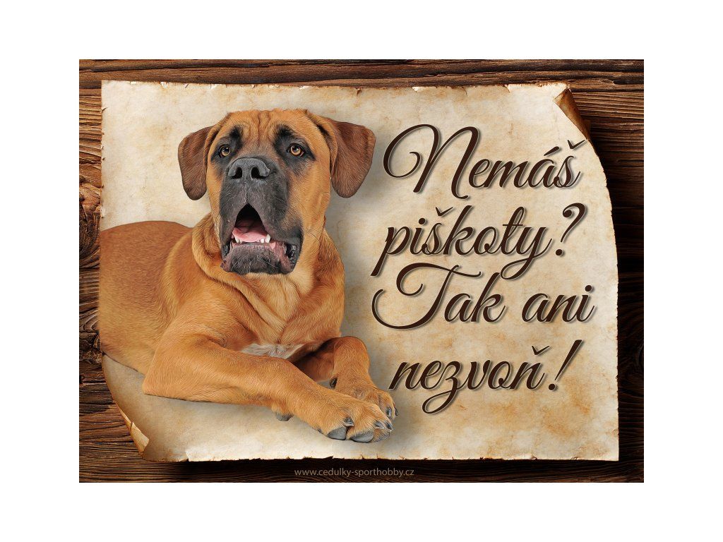 Ta nejlepší cedulka pro všechny majitele Cane Corso! Představujeme vám hliníkovou venkovní cedulku s nápisem, který rozhodně zaujme: "Nemáš piškoty? Tak ani nezvoň!"