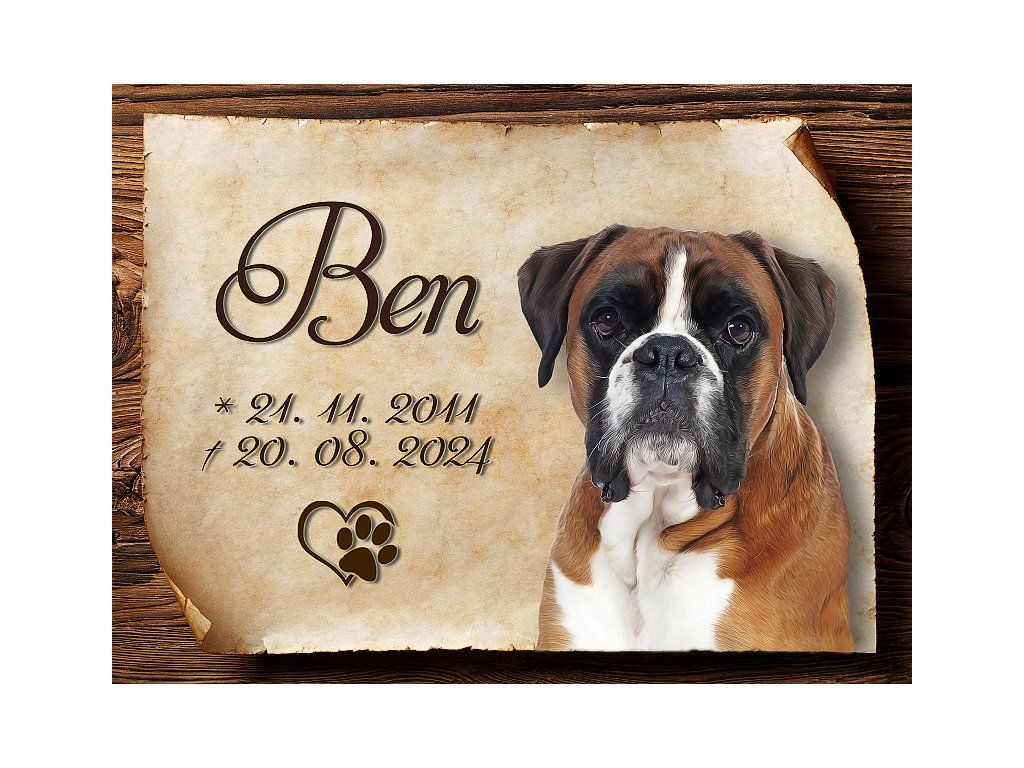 Hliníková cedulka s vlastním psem a nebo s kterýmkoliv psem z naší nabídky a se jménem a daty narození a úmrtí. Kovová výstražná venkovní cedulka. Velikosti těchto cedulek jsou 15x11,25 a 20x15 a 26,7x20 cm. Cedulky jsou tištěny sublimační technologií Grawerton přímo na plech. Cedulky dodáváme běžně se zakulacenými rohy.