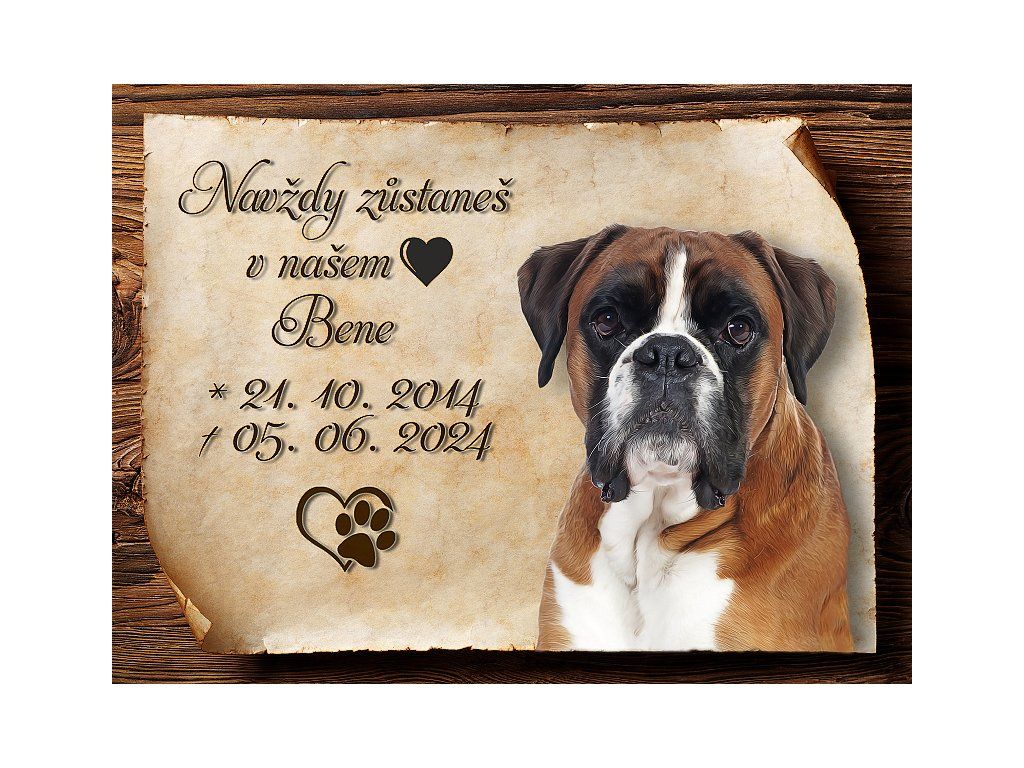 Hliníková cedulka s vlastním psem a nebo s kterýmkoliv psem z naší nabídky a se jménem a daty narození a úmrtí. Kovová výstražná venkovní cedulka. Velikosti těchto cedulek jsou 15x11,25 a 20x15 a 26,7x20 cm. Cedulky jsou tištěny sublimační technologií Grawerton přímo na plech. Cedulky dodáváme běžně se zakulacenými rohy.