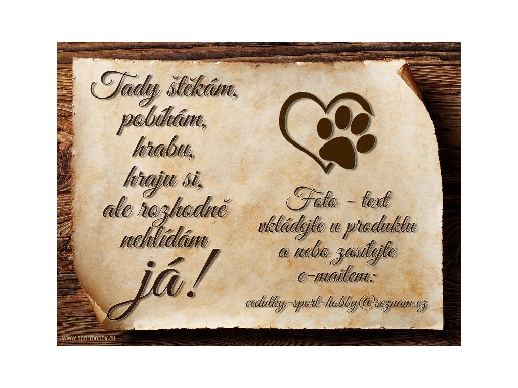 Cedulka s vlastním psem, hliníková s nápisem "Tady štěkám, pobíhám ...." Kovová výstražná venkovní cedulka oznamující to či ono, že se ve vašem obydlí může návštěvník setkat s vašim čtyřnohým miláčkem a jeho teritoriem. Velikosti těchto cedulek jsou 15x11,25 a 20x15 a 26,7x20 cm. Cedulky jsou tištěny sublimační technologií Grawerton přímo na plech. Cedulky dodáváme běžně se zakulacenými rohy. Pokud budete chtít na cedulku vlastní text, napište nám jej do poznámky. Zde můžete objednávat cedulku s motivem vašeho psa. Fotografii vkládejte přímo do kolonky "Vybrat a vložit vaše foto" a nebo pošlete jednoduše e-mailem s číslem objednávky. Fotografie zasílejte ve formátu JPG, PDF, TIF apod. pokud možno v lepší kvalitě. Úpravu - "vyříznutí" z pozadí můžete nechat na nás.