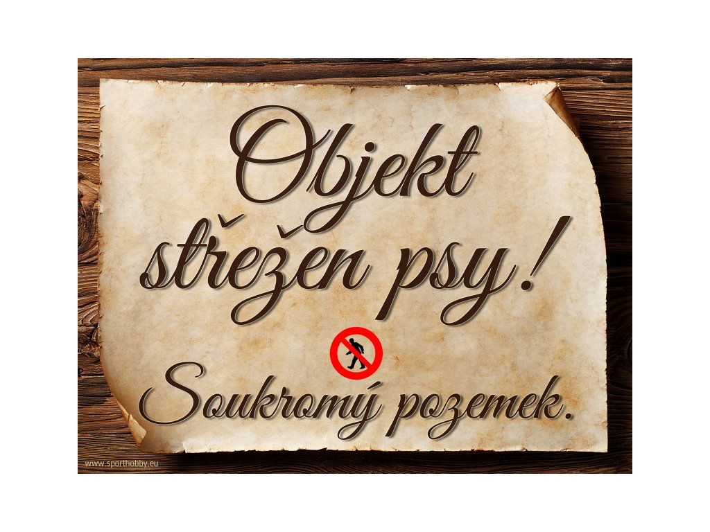 Cedulka s vlastním psem, hliníková s nápisem "Cedulka Objekt střežen psy! Soukromý pozemek." Kovová výstražná venkovní cedulka oznamující to či ono, že se ve vašem obydlí může návštěvník setkat s vašim čtyřnohým miláčkem a jeho teritoriem. Velikosti těchto cedulek jsou 15x11,25 a 20x15 a 26,7x20 cm. Cedulky jsou tištěny sublimační technologií Grawerton přímo na plech. Cedulky dodáváme běžně se zakulacenými rohy. Pokud budete chtít na cedulku vlastní text, napište nám jej do poznámky.
