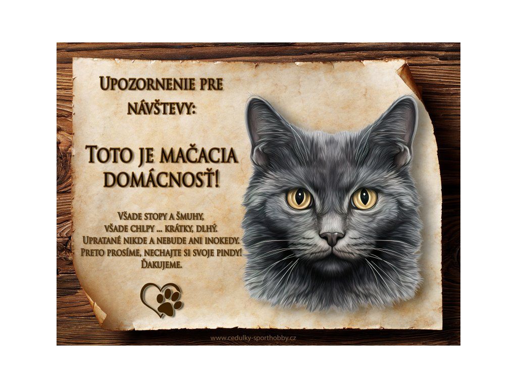 Tuto cedulku vyrábíme v češtině i slovenštině. Vtipná kovová cedulka s nápisem "Kočičí domácnost ..." vyobrazení plemene Chantilly Tiffany 1. Kovová - hliníková cedulka vhodná pro umístění do domu i na venek. Velikosti této cedulky je 20x15 cm, má zakulacené rohy. Cedulky jsou tištěny sublimační technologií Grawerton přímo na plech.