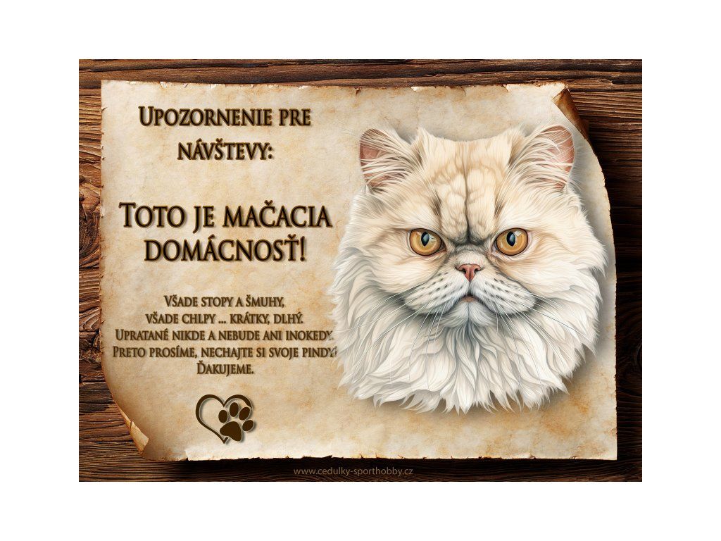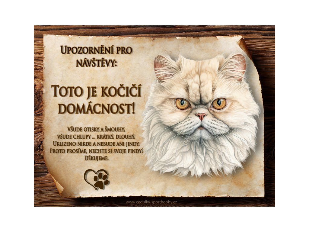 Tuto cedulku vyrábíme v češtině i slovenštině. Vtipná kovová cedulka s nápisem "Kočičí domácnost ..." vyobrazení plemene Perská. Kovová - hliníková cedulka vhodná pro umístění do domu i na venek. Velikosti této cedulky je 20x15 cm, má zakulacené rohy. Cedulky jsou tištěny sublimační technologií Grawerton přímo na plech.