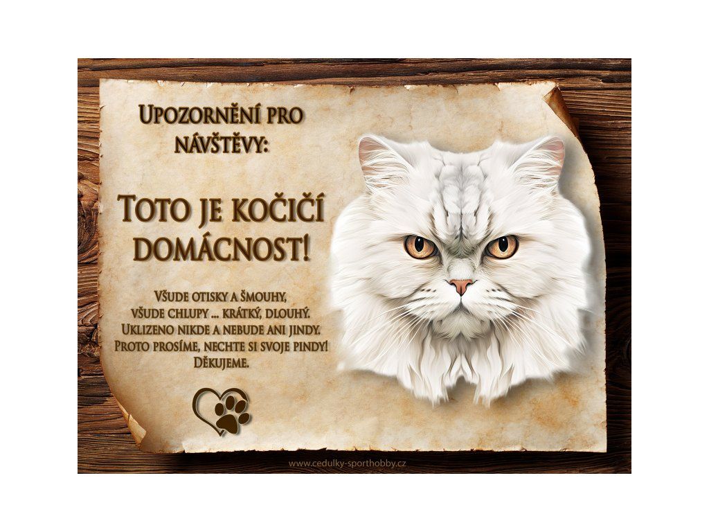 Tuto cedulku vyrábíme v češtině i slovenštině. Vtipná kovová cedulka s nápisem "Kočičí domácnost ..." vyobrazení plemene Perská 4. Kovová - hliníková cedulka vhodná pro umístění do domu i na venek. Velikosti této cedulky je 20x15 cm, má zakulacené rohy. Cedulky jsou tištěny sublimační technologií Grawerton přímo na plech.