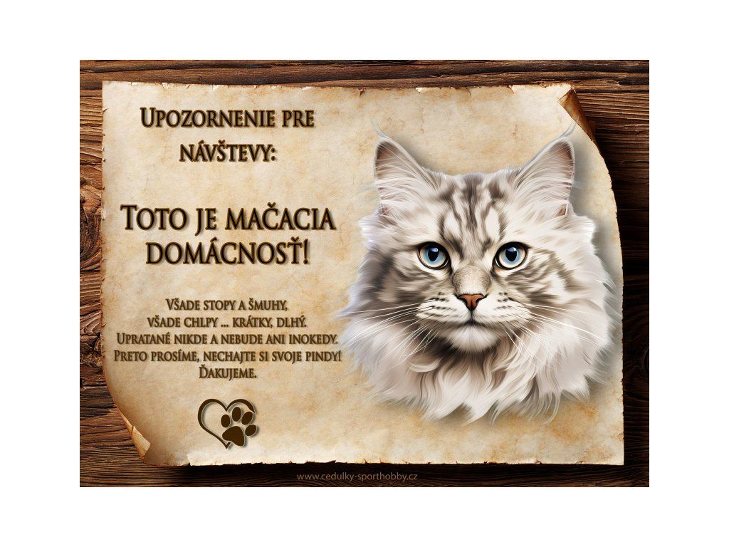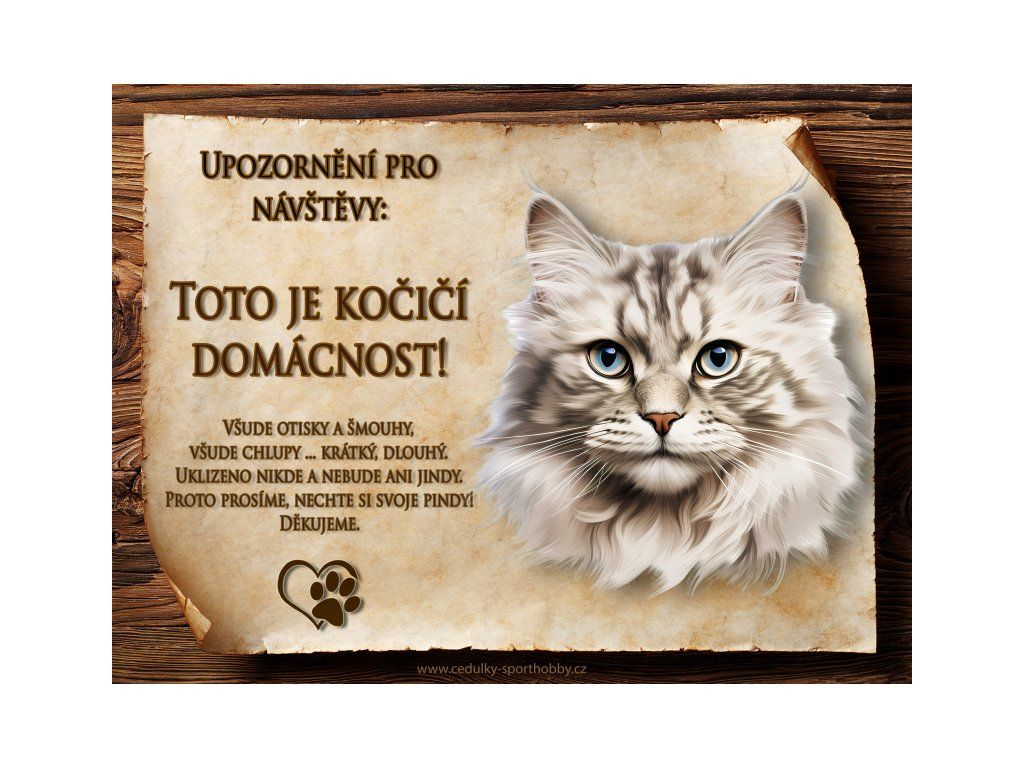 Tuto cedulku vyrábíme v češtině i slovenštině. Vtipná kovová cedulka s nápisem "Kočičí domácnost ..." vyobrazení plemene Ragamuffin 1. Kovová - hliníková cedulka vhodná pro umístění do domu i na venek. Velikosti této cedulky je 20x15 cm, má zakulacené rohy. Cedulky jsou tištěny sublimační technologií Grawerton přímo na plech.
