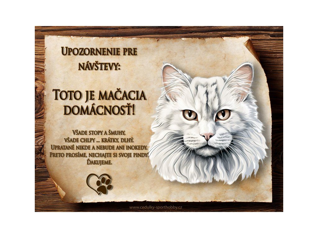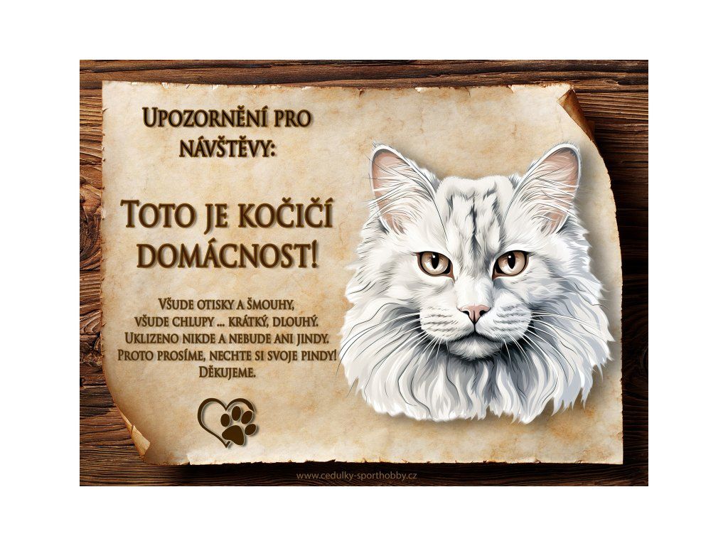 Tuto cedulku vyrábíme v češtině i slovenštině. Vtipná kovová cedulka s nápisem "Kočičí domácnost ..." vyobrazení plemene Ragamuffin 4. Kovová - hliníková cedulka vhodná pro umístění do domu i na venek. Velikosti této cedulky je 20x15 cm, má zakulacené rohy. Cedulky jsou tištěny sublimační technologií Grawerton přímo na plech.