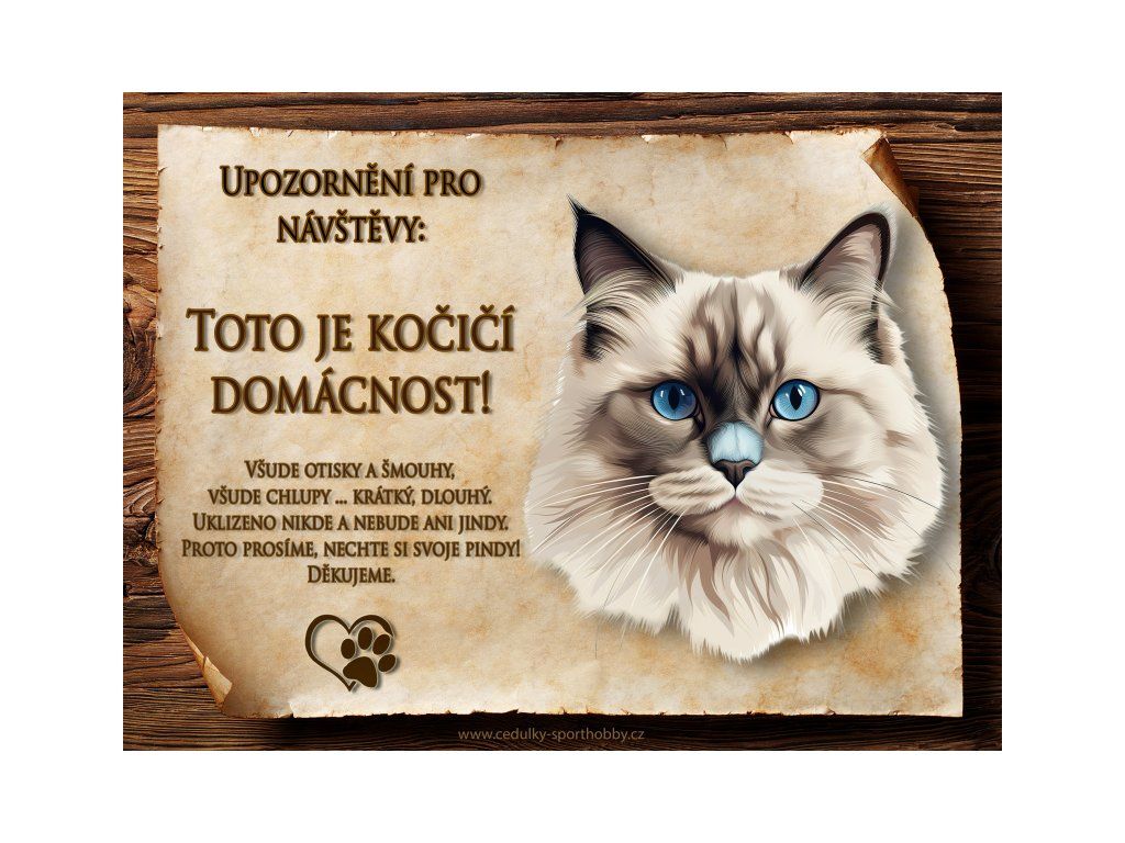 Tuto cedulku vyrábíme v češtině i slovenštině. Vtipná kovová cedulka s nápisem "Kočičí domácnost ..." vyobrazení plemene Ragdoll 1. Kovová - hliníková cedulka vhodná pro umístění do domu i na venek. Velikosti této cedulky je 20x15 cm, má zakulacené rohy. Cedulky jsou tištěny sublimační technologií Grawerton přímo na plech.