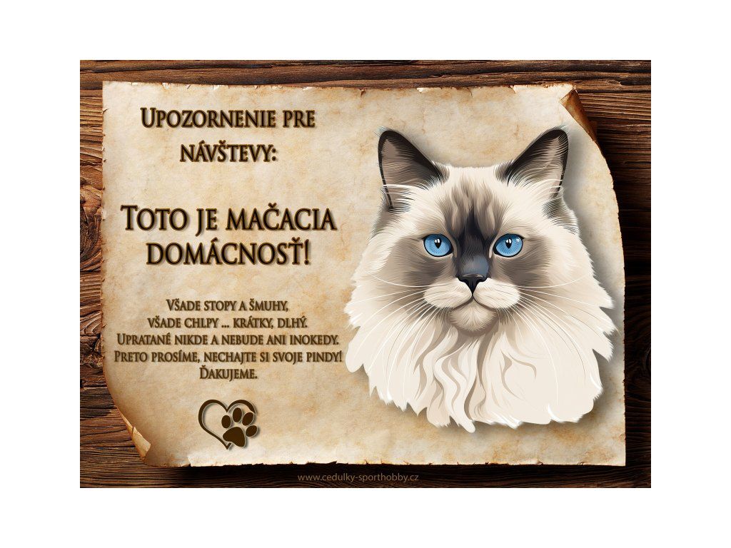 Tuto cedulku vyrábíme v češtině i slovenštině. Vtipná kovová cedulka s nápisem "Kočičí domácnost ..." vyobrazení plemene Himalájská. Kovová - hliníková cedulka vhodná pro umístění do domu i na venek. Velikosti této cedulky je 20x15 cm, má zakulacené rohy. Cedulky jsou tištěny sublimační technologií Grawerton přímo na plech.