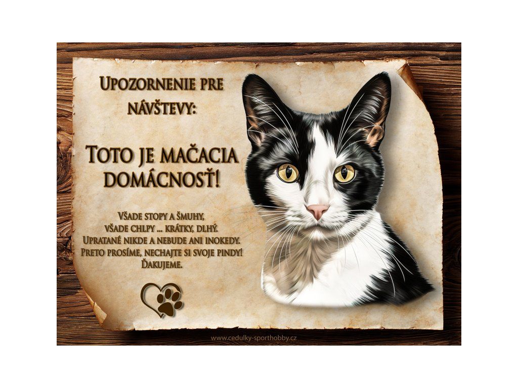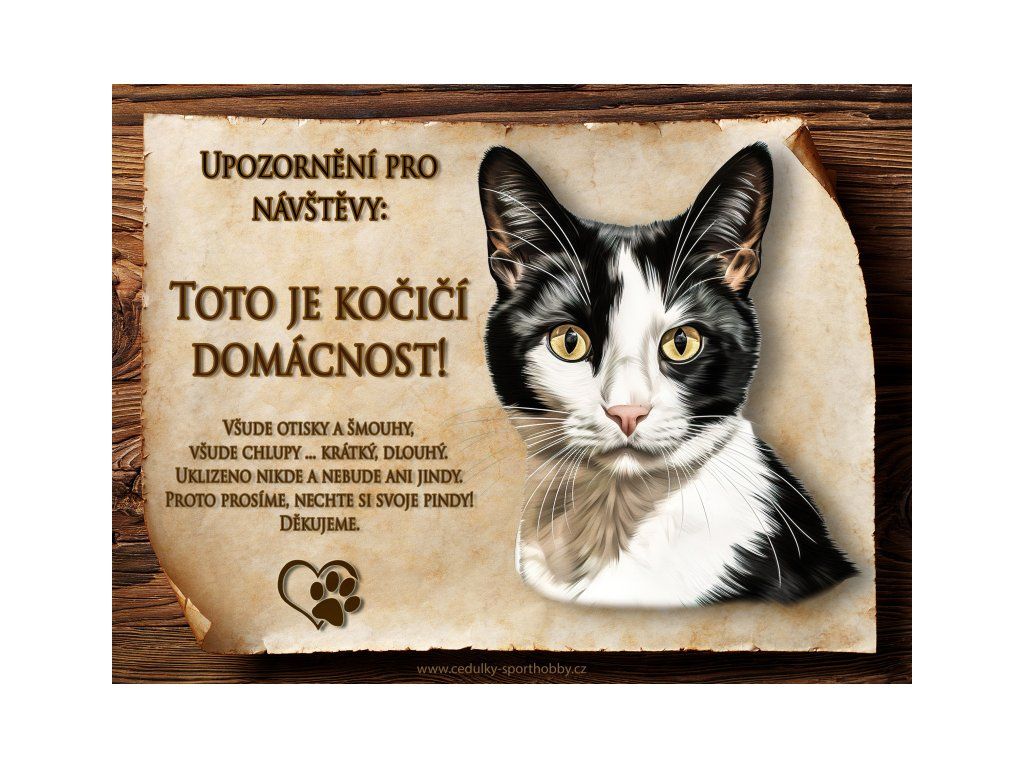 Tuto cedulku vyrábíme v češtině i slovenštině. Vtipná kovová cedulka s nápisem "Kočičí domácnost ..." vyobrazení plemene Japonský bobtail. Kovová - hliníková cedulka vhodná pro umístění do domu i na venek. Velikosti této cedulky je 20x15 cm, má zakulacené rohy. Cedulky jsou tištěny sublimační technologií Grawerton přímo na plech.