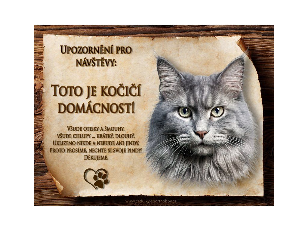 Tuto cedulku vyrábíme v češtině i slovenštině. Vtipná kovová cedulka s nápisem "Kočičí domácnost ..." vyobrazení plemene Nebelung. Kovová - hliníková cedulka vhodná pro umístění do domu i na venek. Velikosti této cedulky je 20x15 cm, má zakulacené rohy. Cedulky jsou tištěny sublimační technologií Grawerton přímo na plech.