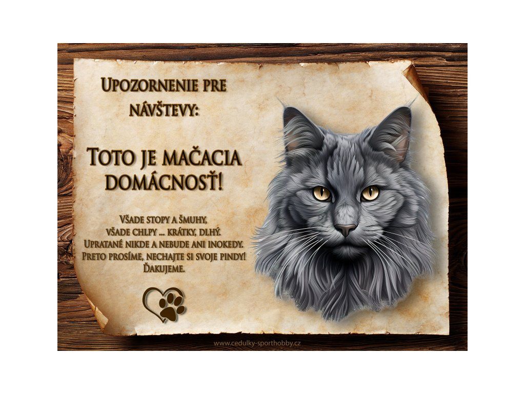 Tuto cedulku vyrábíme v češtině i slovenštině. Vtipná kovová cedulka s nápisem "Kočičí domácnost ..." vyobrazení plemene Nebelung 2. Kovová - hliníková cedulka vhodná pro umístění do domu i na venek. Velikosti této cedulky je 20x15 cm, má zakulacené rohy. Cedulky jsou tištěny sublimační technologií Grawerton přímo na plech.