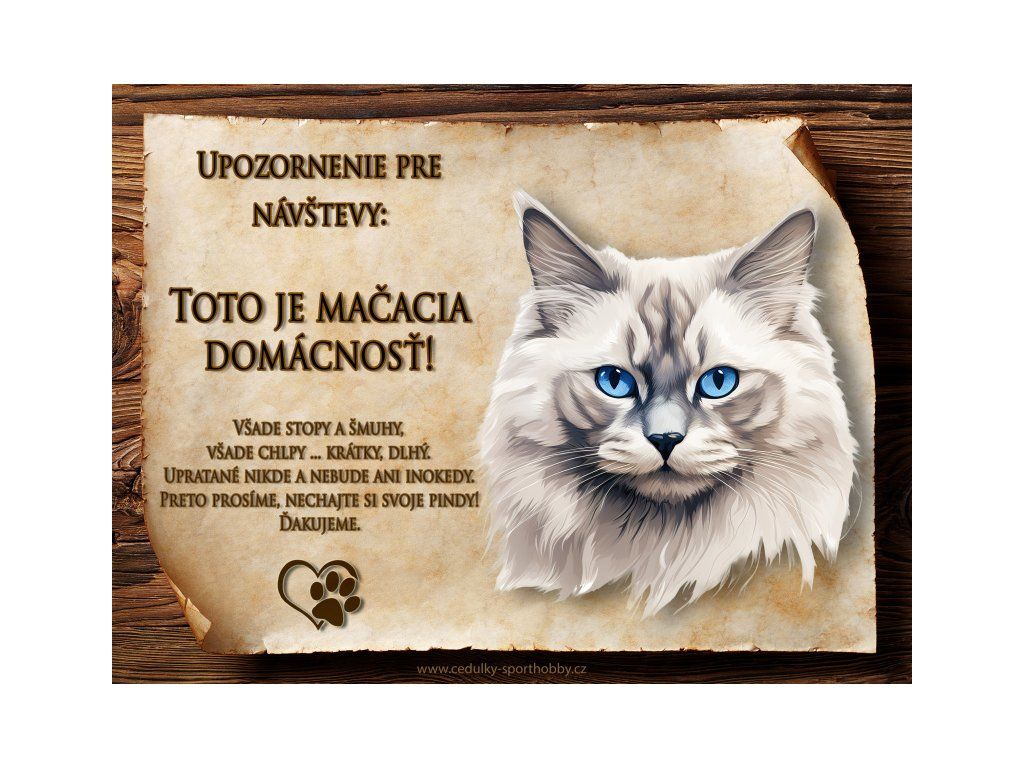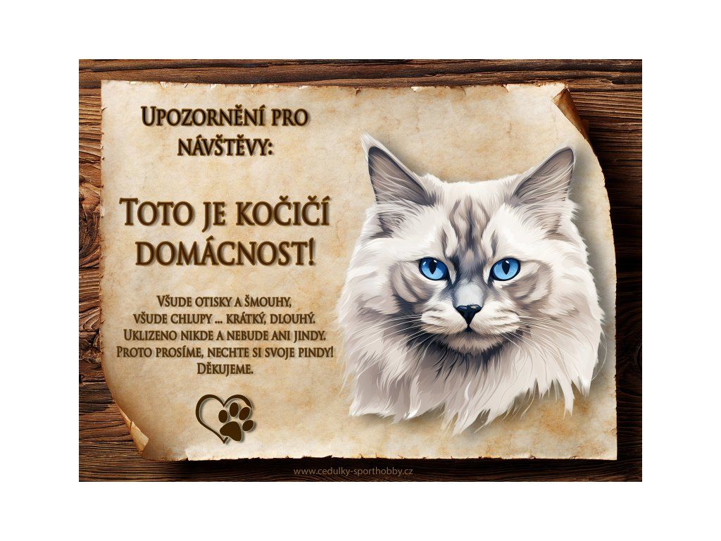 Tuto cedulku vyrábíme v češtině i slovenštině. Vtipná kovová cedulka s nápisem "Kočičí domácnost ..." vyobrazení plemene Něvská maškaráda. Kovová - hliníková cedulka vhodná pro umístění do domu i na venek. Velikosti této cedulky je 20x15 cm, má zakulacené rohy. Cedulky jsou tištěny sublimační technologií Grawerton přímo na plech.
