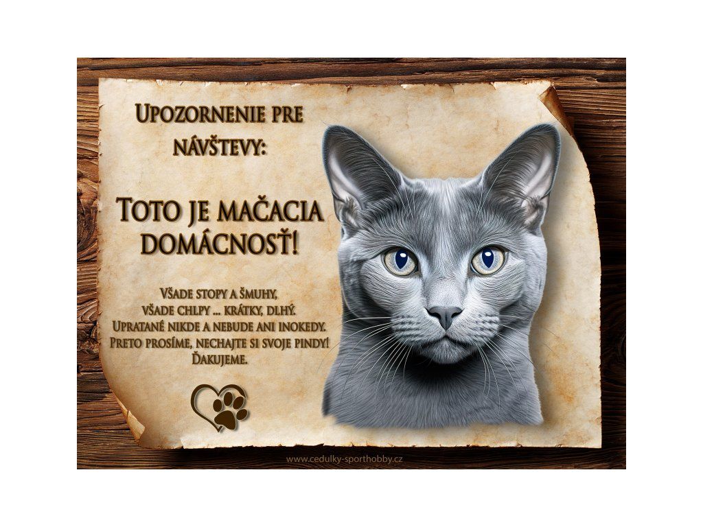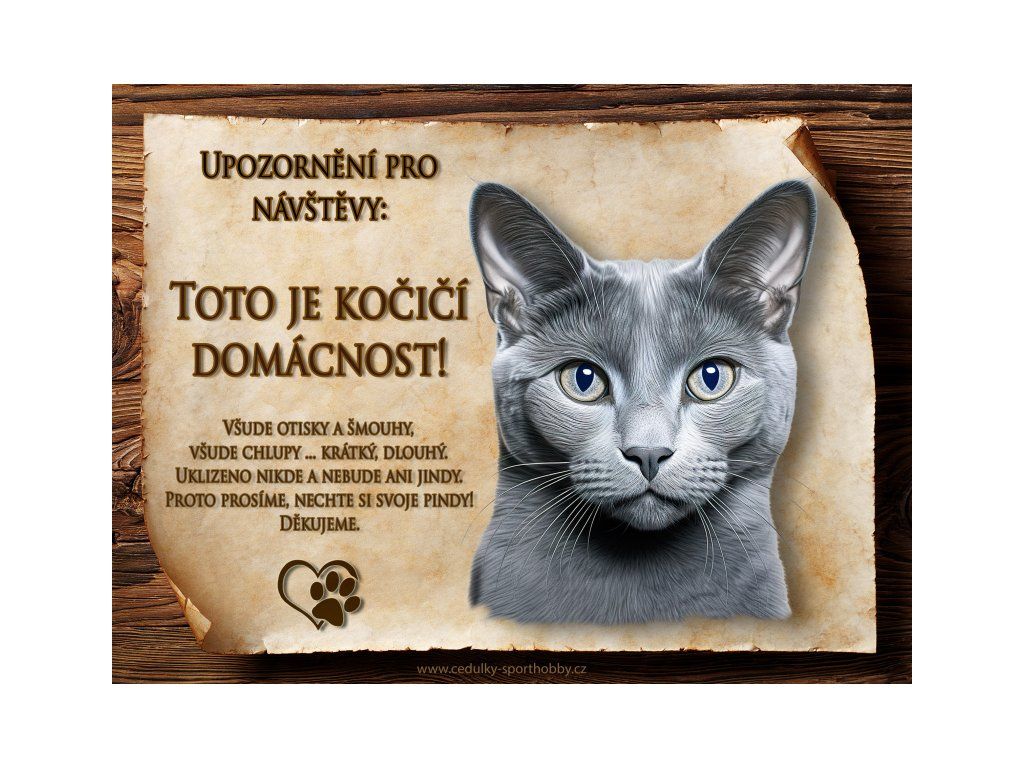 Tuto cedulku vyrábíme v češtině i slovenštině. Vtipná kovová cedulka s nápisem "Kočičí domácnost ..." vyobrazení plemene Ruská modrá 1. Kovová - hliníková cedulka vhodná pro umístění do domu i na venek. Velikosti této cedulky je 20x15 cm, má zakulacené rohy. Cedulky jsou tištěny sublimační technologií Grawerton přímo na plech.
