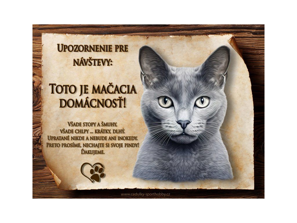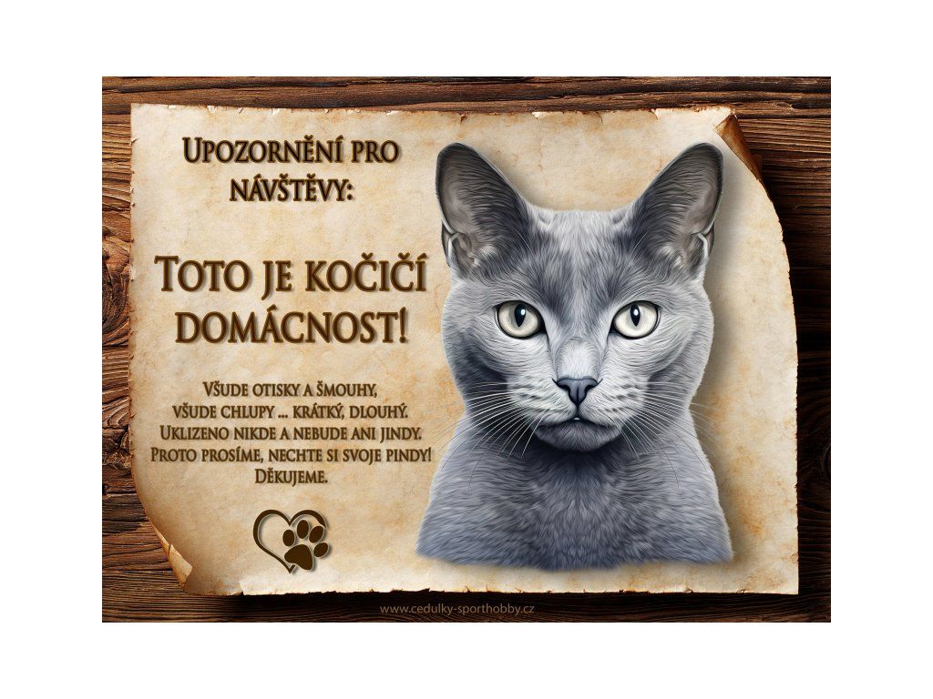Tuto cedulku vyrábíme v češtině i slovenštině. Vtipná kovová cedulka s nápisem "Kočičí domácnost ..." vyobrazení plemene Ruská modrá 2. Kovová - hliníková cedulka vhodná pro umístění do domu i na venek. Velikosti této cedulky je 20x15 cm, má zakulacené rohy. Cedulky jsou tištěny sublimační technologií Grawerton přímo na plech.