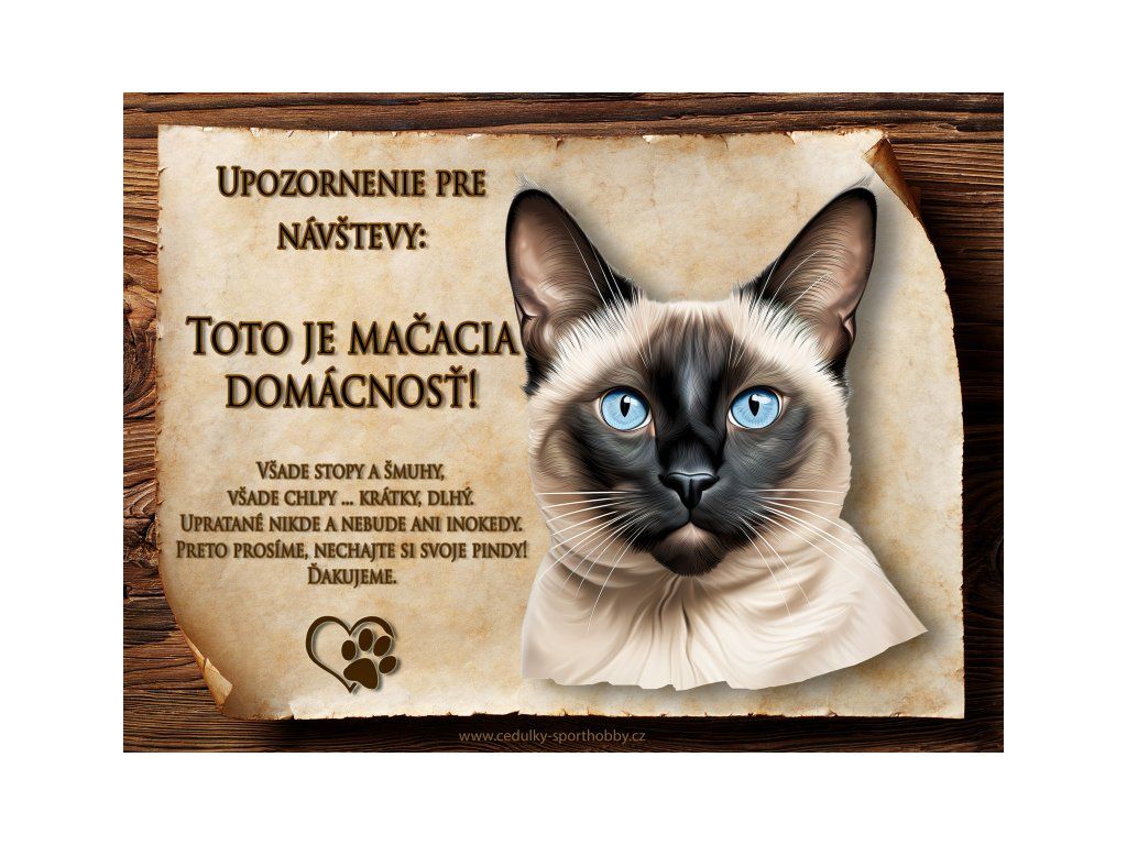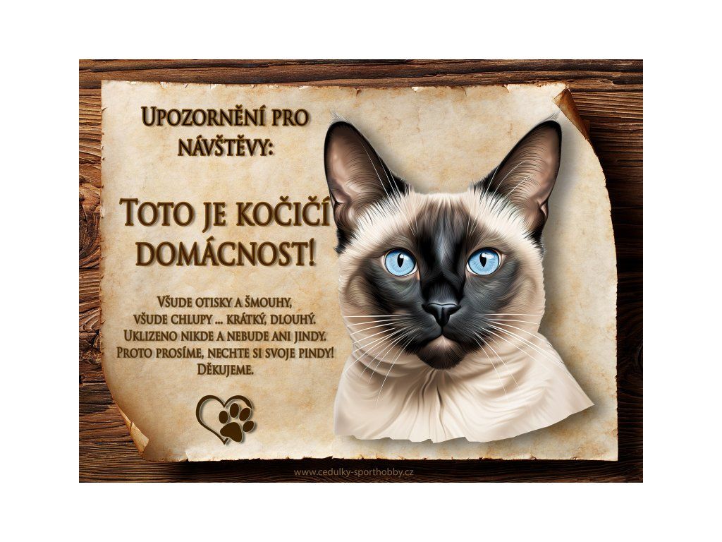 Tuto cedulku vyrábíme v češtině i slovenštině. Vtipná kovová cedulka s nápisem "Kočičí domácnost ..." vyobrazení plemene Siamská. Kovová - hliníková cedulka vhodná pro umístění do domu i na venek. Velikosti této cedulky je 20x15 cm, má zakulacené rohy. Cedulky jsou tištěny sublimační technologií Grawerton přímo na plech.
