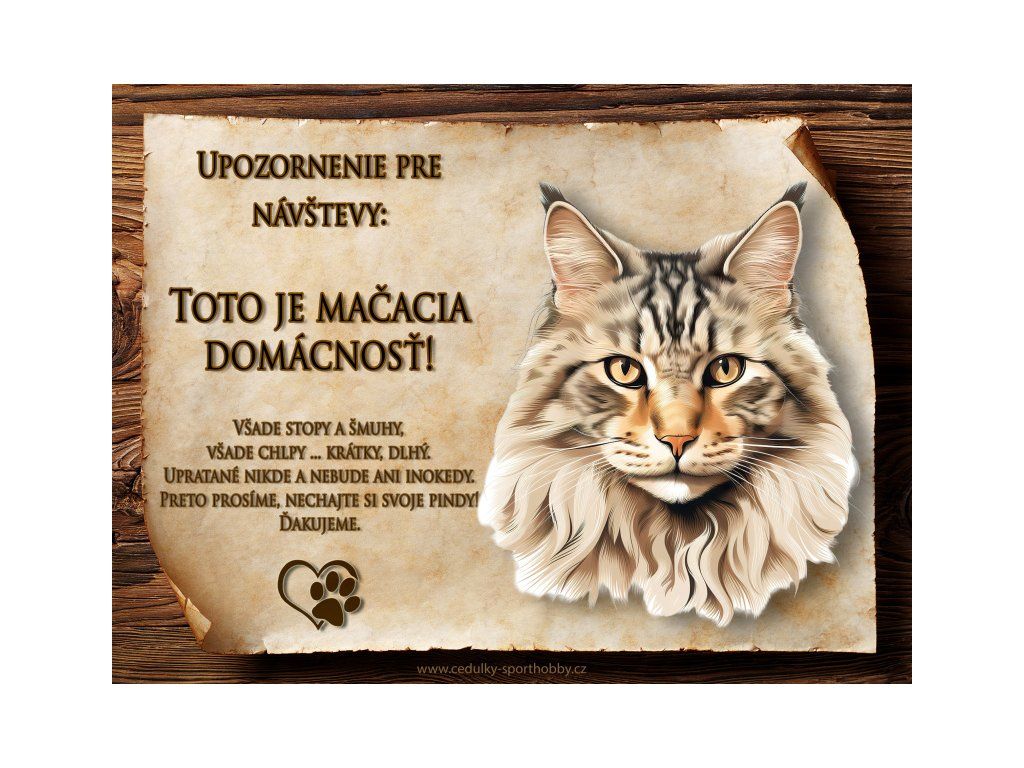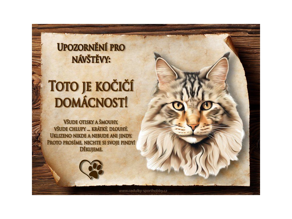 Tuto cedulku vyrábíme v češtině i slovenštině. Vtipná kovová cedulka s nápisem "Kočičí domácnost ..." vyobrazení plemene Sibiřská. Kovová - hliníková cedulka vhodná pro umístění do domu i na venek. Velikosti této cedulky je 20x15 cm, má zakulacené rohy. Cedulky jsou tištěny sublimační technologií Grawerton přímo na plech.