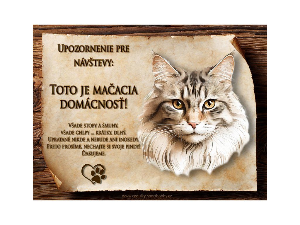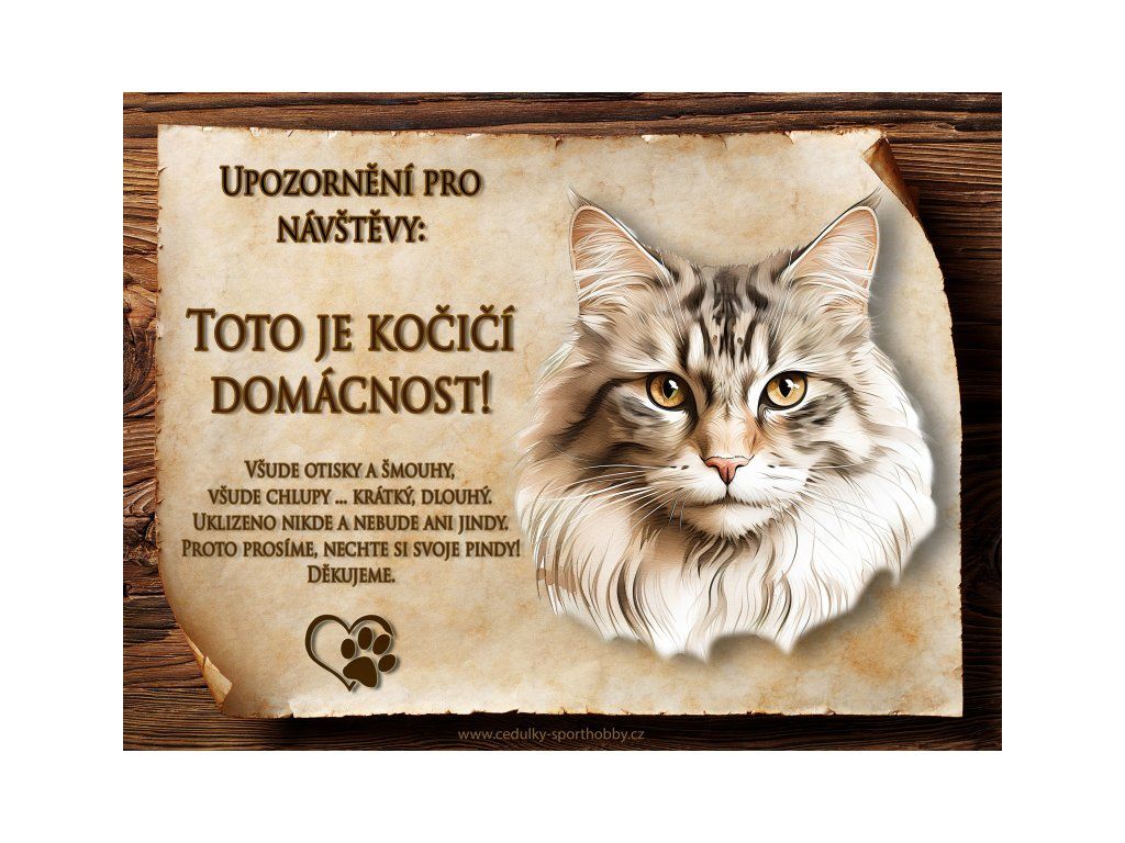 Tuto cedulku vyrábíme v češtině i slovenštině. Vtipná kovová cedulka s nápisem "Kočičí domácnost ..." vyobrazení plemene Sibiřská 1. Kovová - hliníková cedulka vhodná pro umístění do domu i na venek. Velikosti této cedulky je 20x15 cm, má zakulacené rohy. Cedulky jsou tištěny sublimační technologií Grawerton přímo na plech.